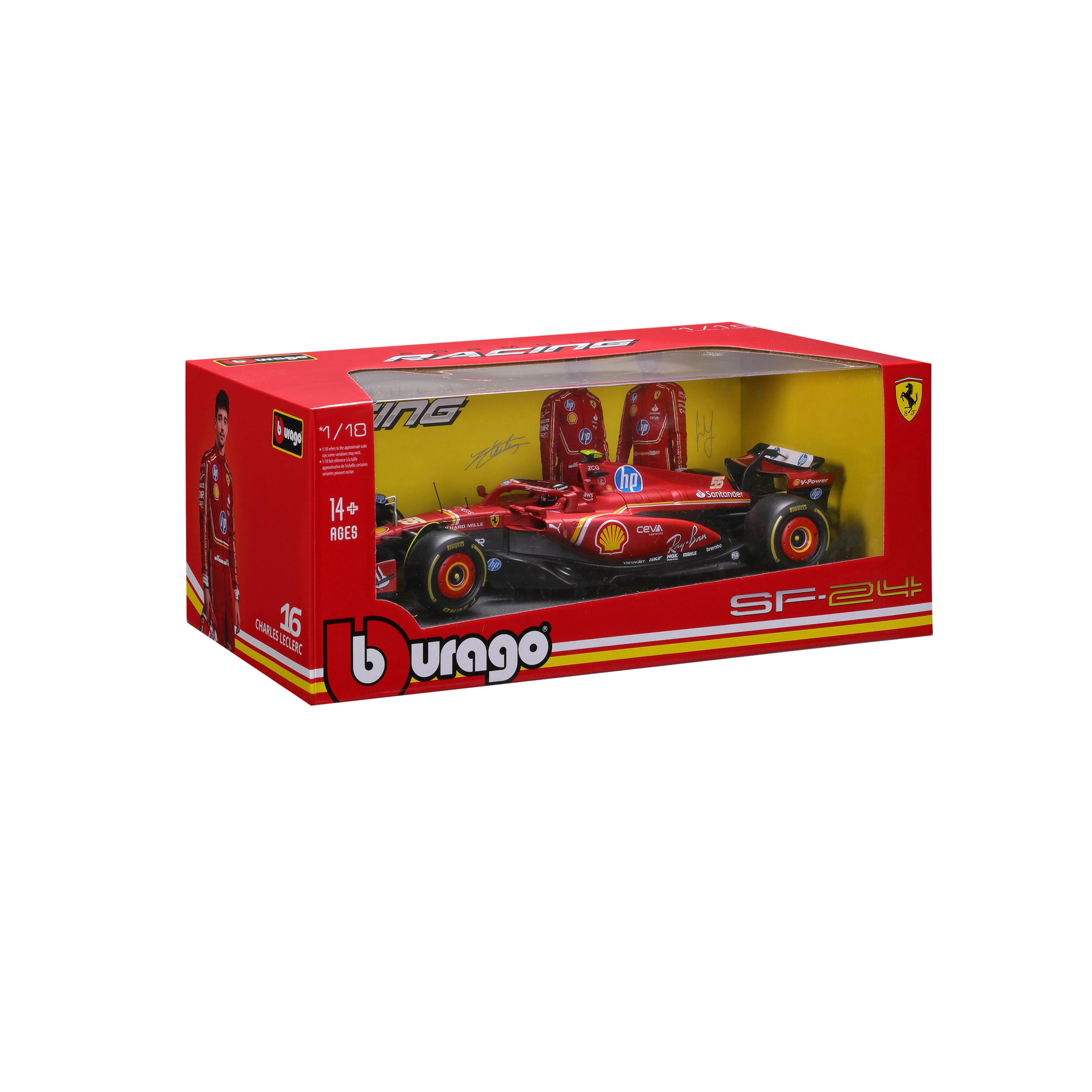 The collectible Bburago car in 1:18 scale faithfully depicts the Ferrari SF-24 with number 55 of driver Carlos Sainz. Precise die-cast construction, authentic decals and sponsor liveries, realistic wheels, and aerodynamic elements make this model a great piece for any display case. Includes a driver figure and decorative gift packaging.