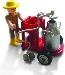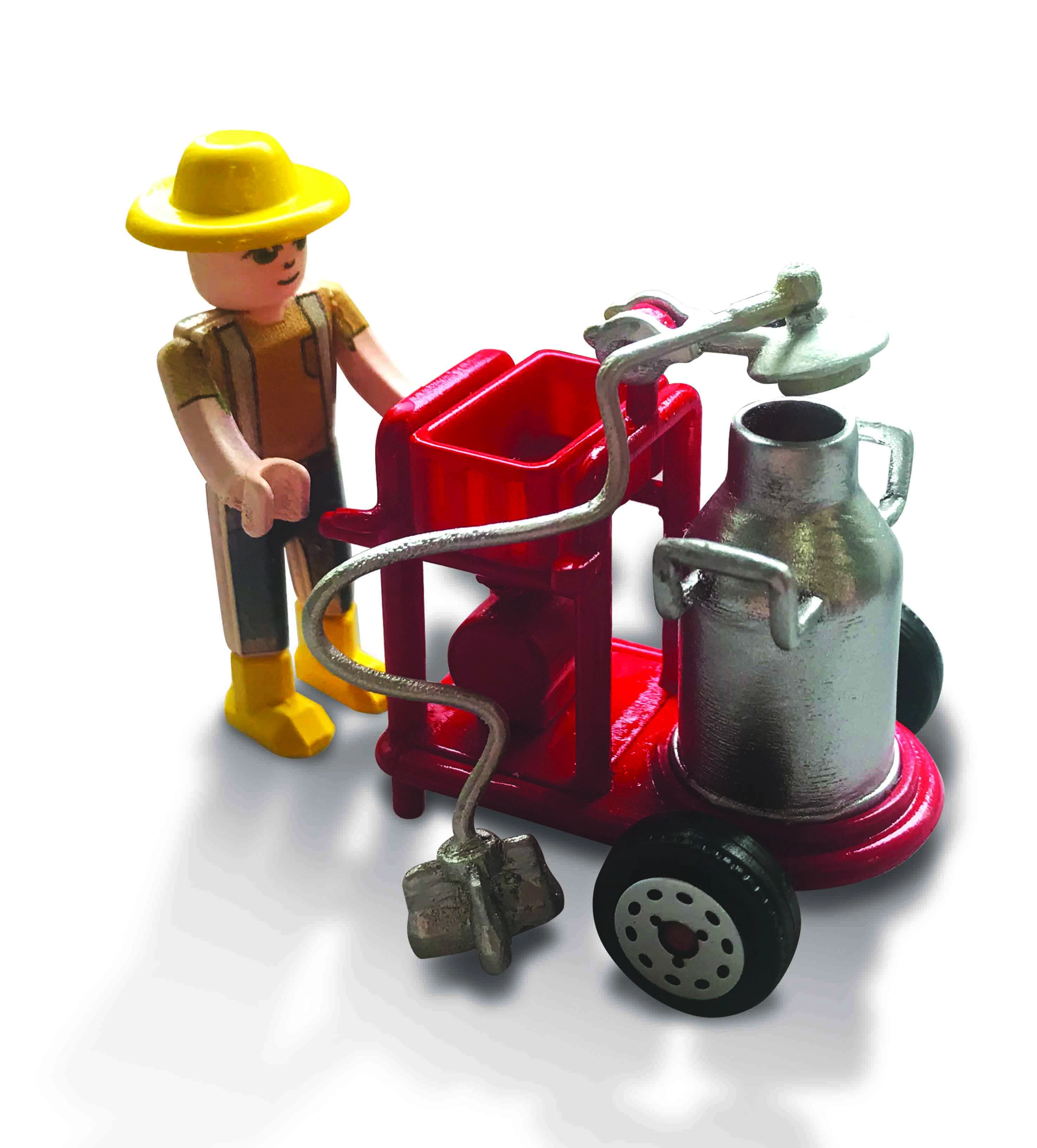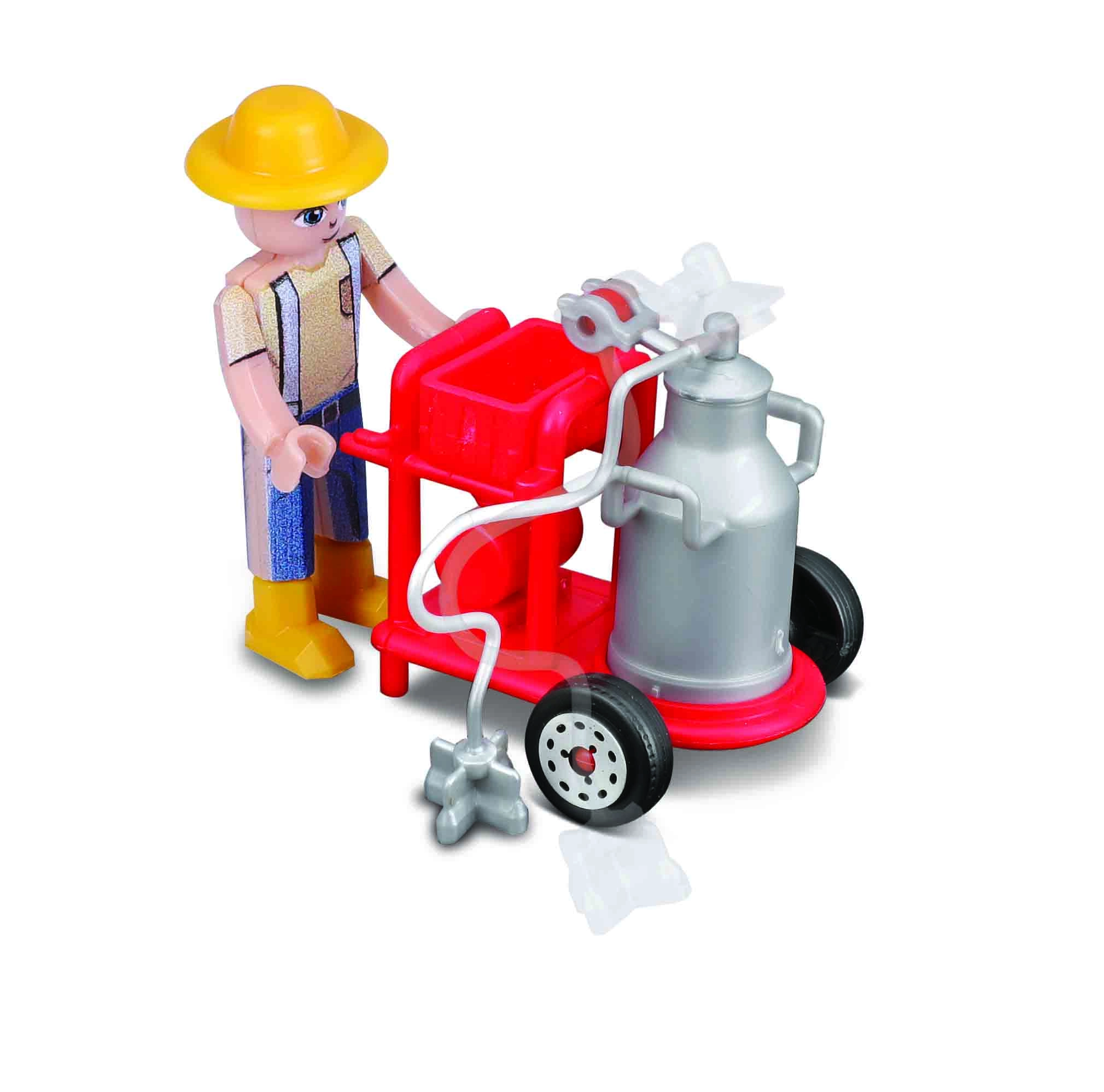The farmer with a mobile milker and hoses brings authentic farm routine. The cart is easy to handle and expands play possibilities.