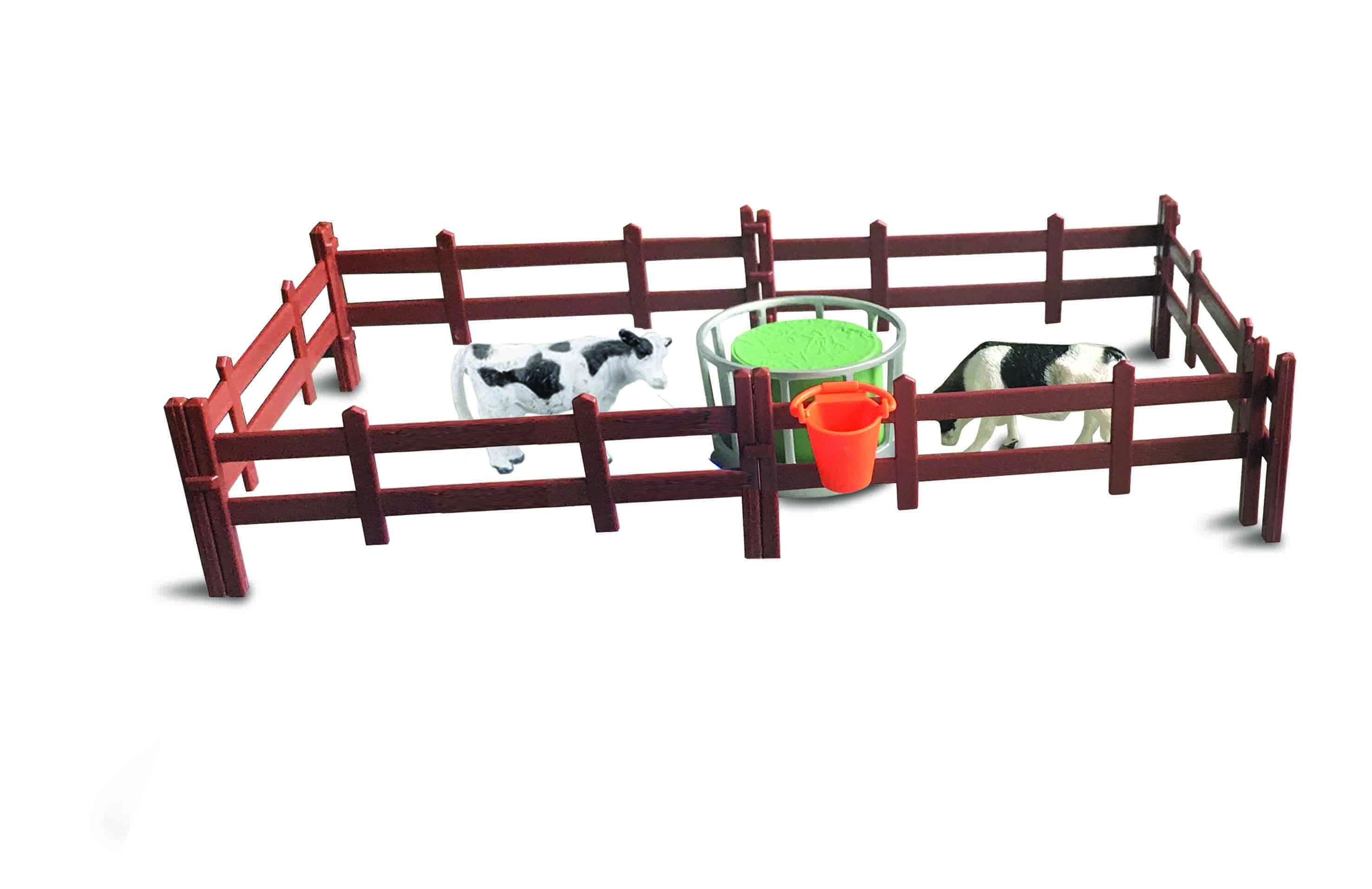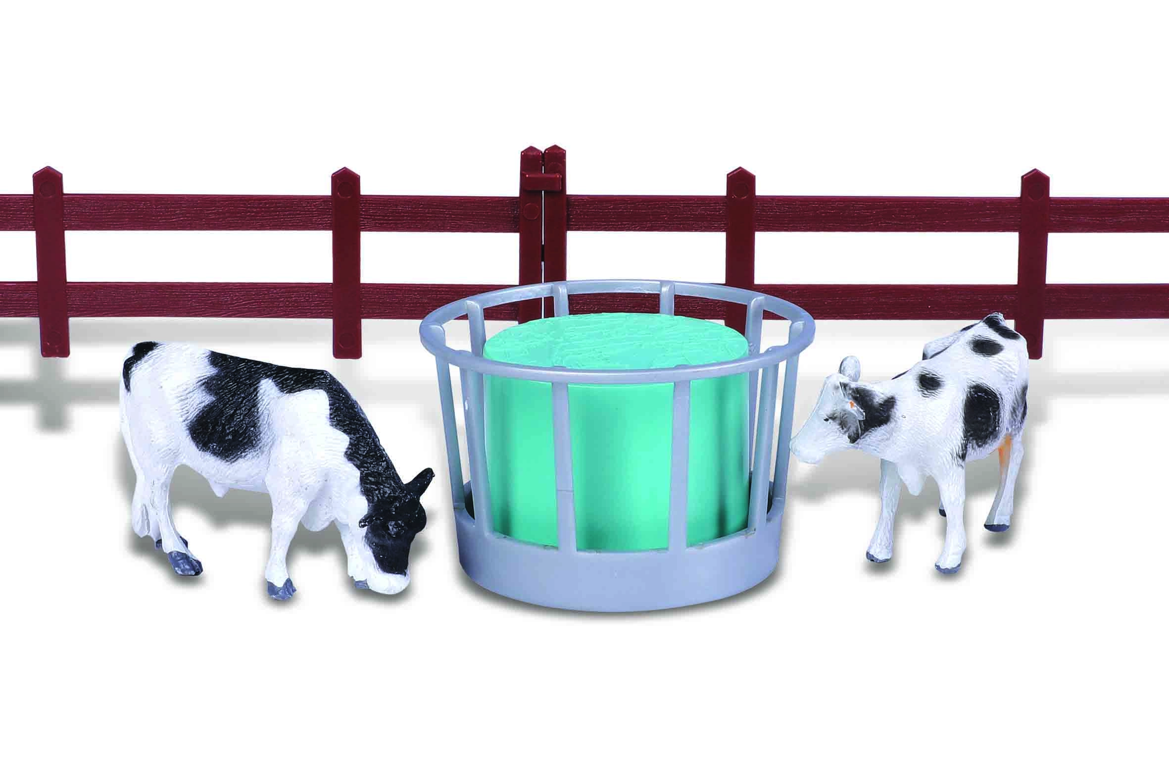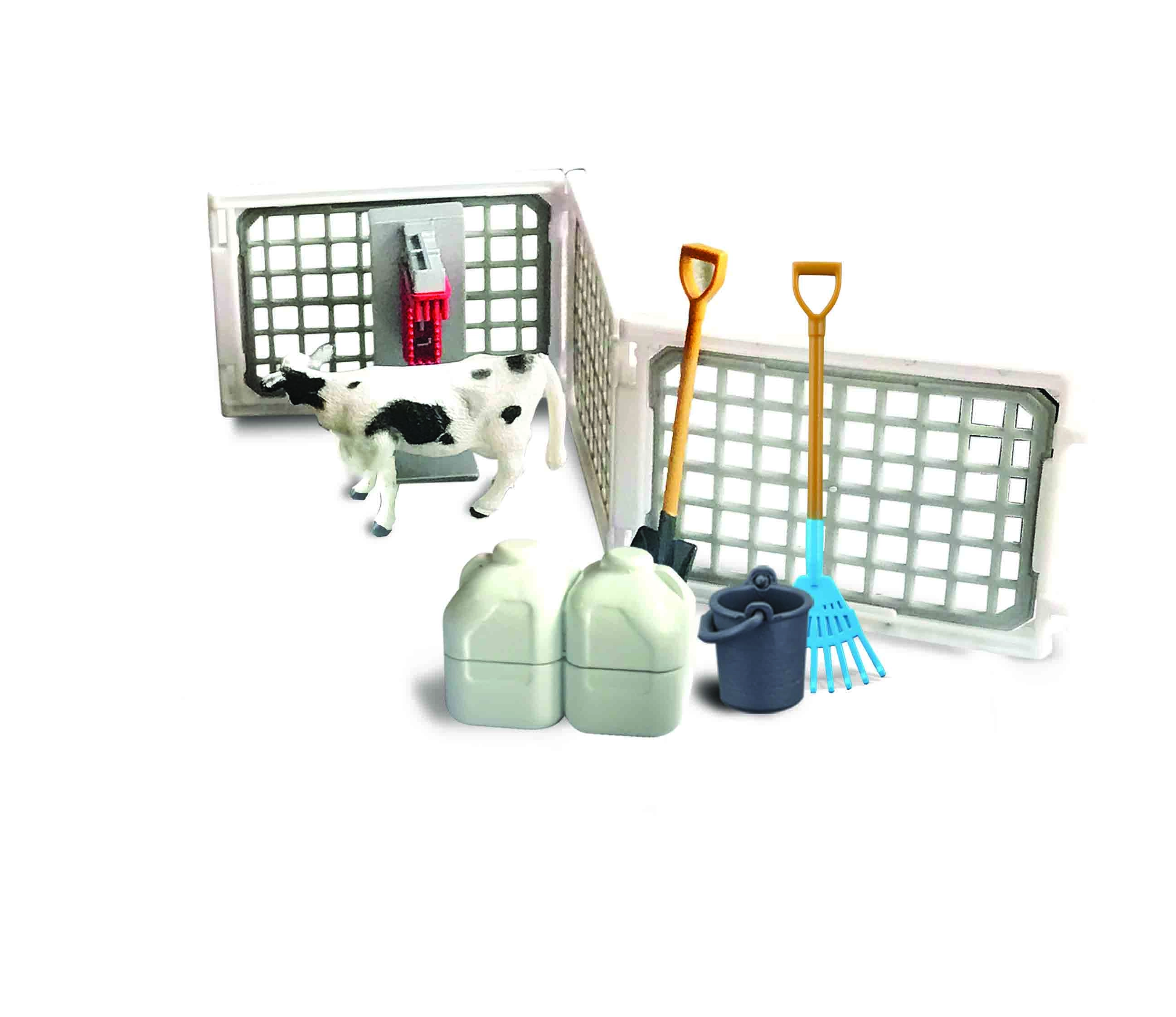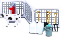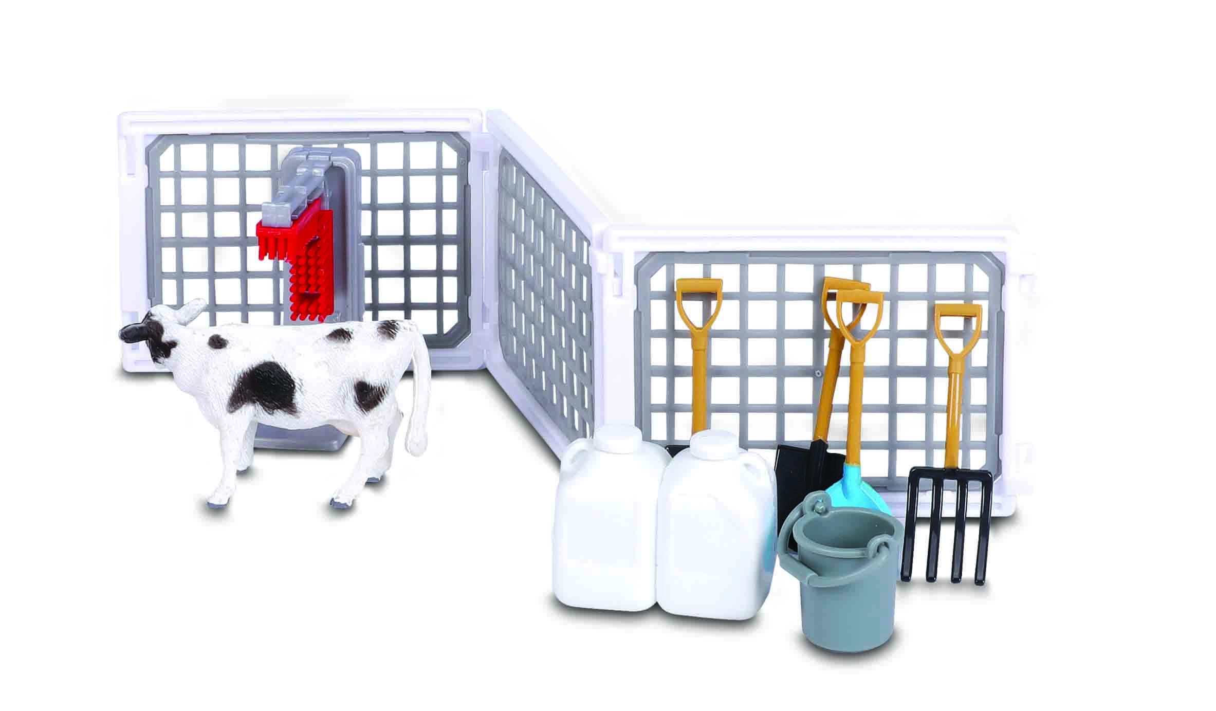 - Cow figures, modular fences, feeder, bucket, tools (shovels, rakes, pitchforks), canisters, milking accessories, farmer figure, mobile cart