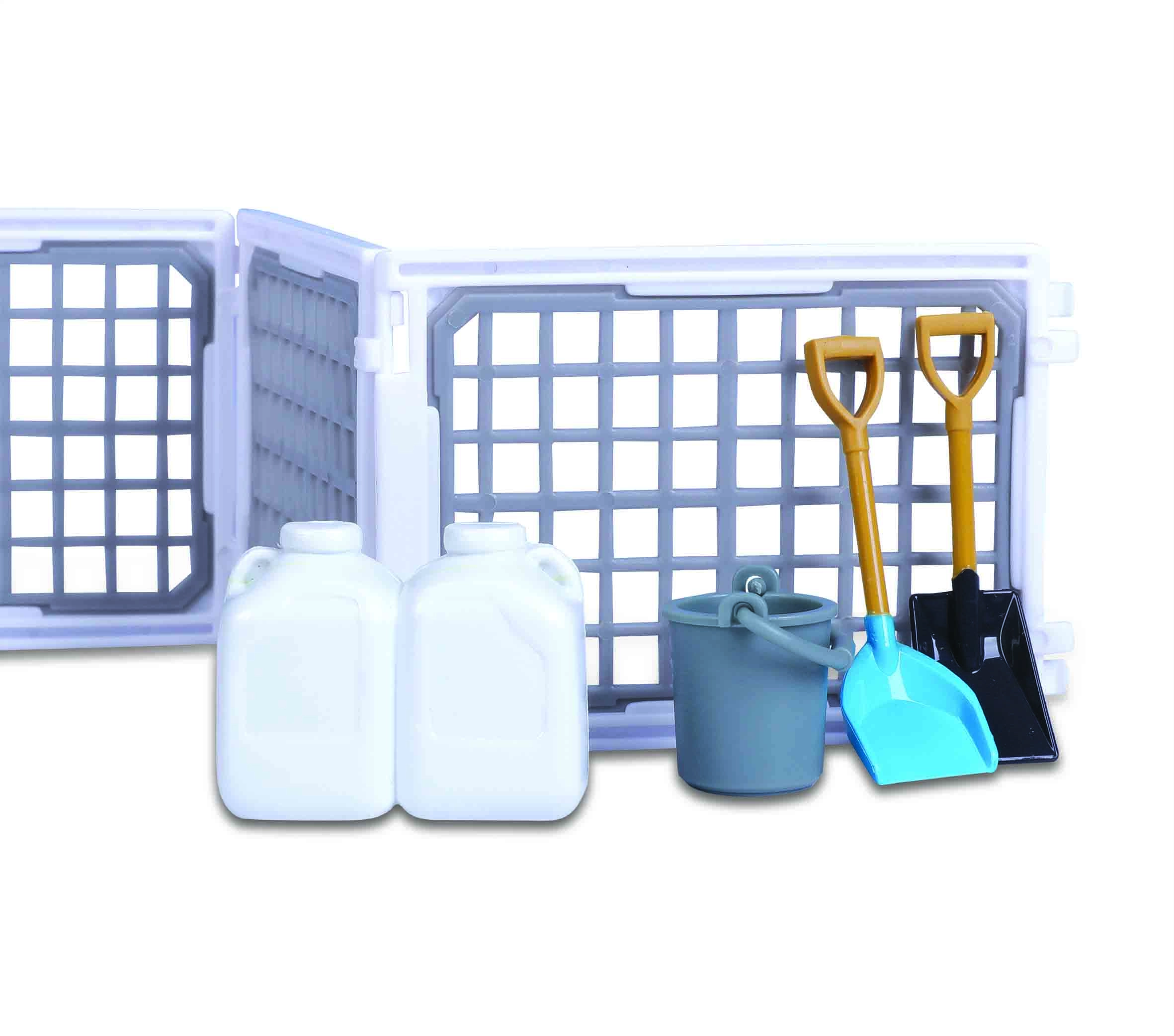 Shovels, rakes, buckets, and canisters help maintain the pen. Kids can try feeding, cleaning, and caring for livestock just like on a real farm.