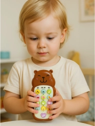 A cute children's phone in the shape of a capybara combines light and sound effects, colorful buttons, and a comfortable wrist strap. It supports sensory development, hand–eye coordination, and natural exploration of the world through melodies, animal sounds, and pretend phone calls. Its smooth surface, ergonomic shape, and lightweight design are ideal for small children's hands.