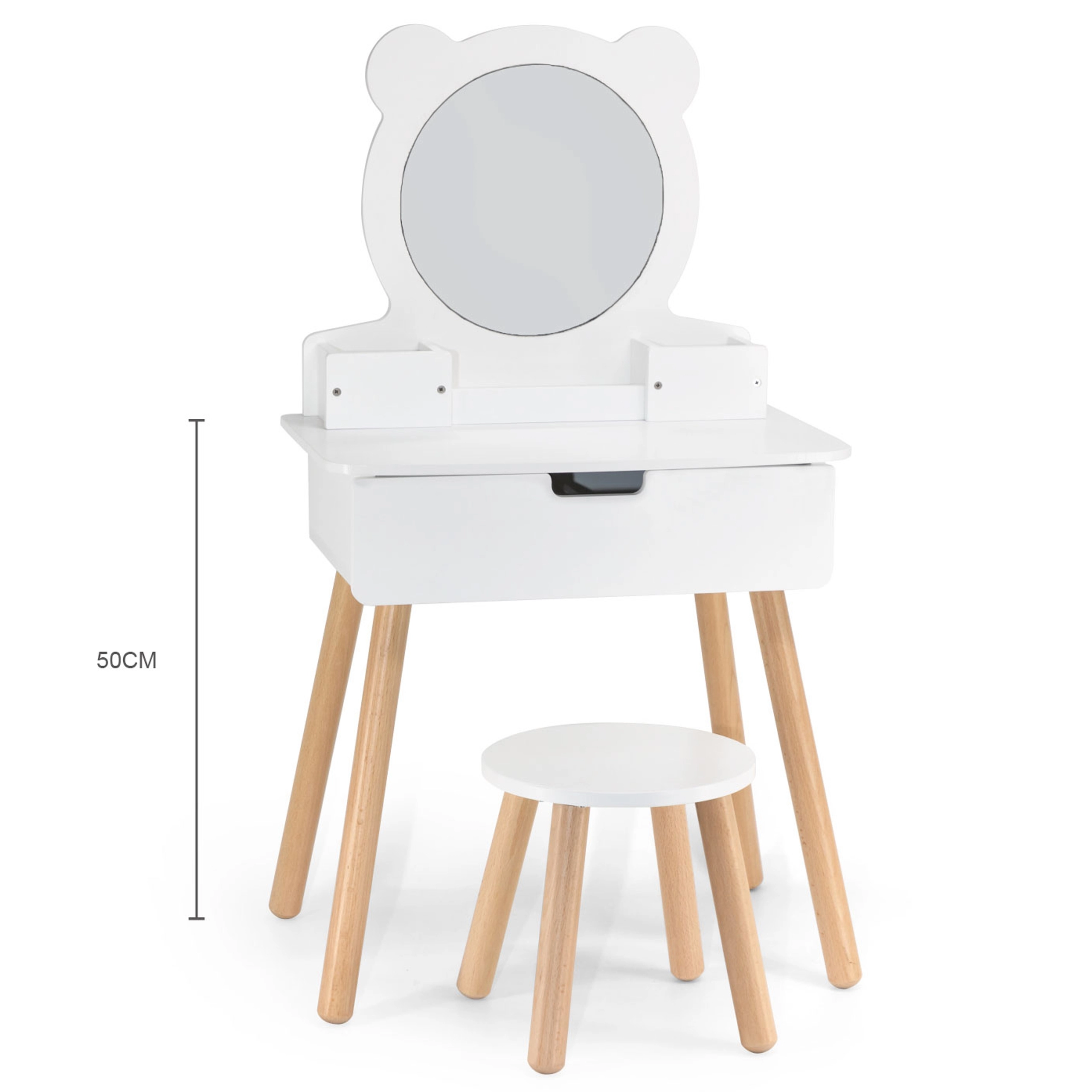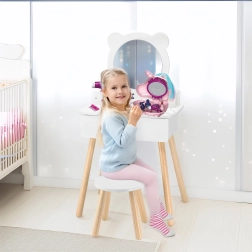 Sturdy wooden construction, a round mirror with “bear ears,” a practical drawer, and compartments keep all accessories neatly in place.