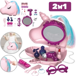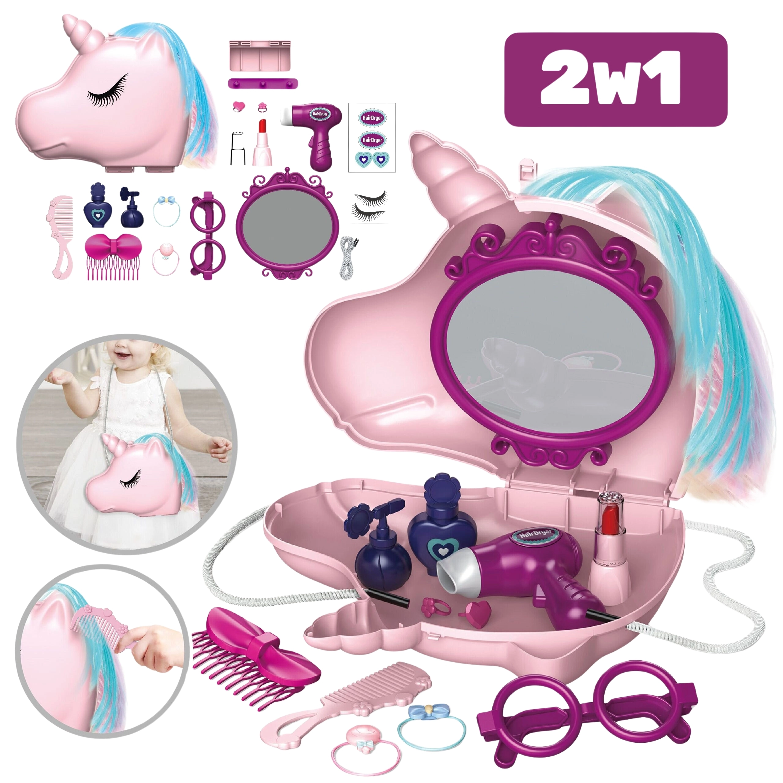 Includes a unicorn bag with 19 accessories: an air-blowing toy hairdryer, hand mirror, combs, clips, “perfumes,” lipstick, and more.
