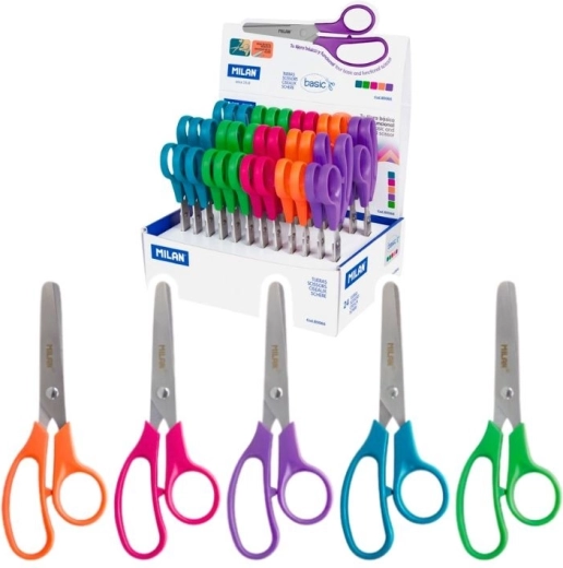 The MILAN Basic kids' scissors with a length of 133 mm are designed for small children's hands and safe use. They feature rounded tips to prevent injury, ergonomic plastic handles for a comfortable grip, and steel blades for precise cutting of paper, cardboard, and creative materials—ideal for school and crafting at home.