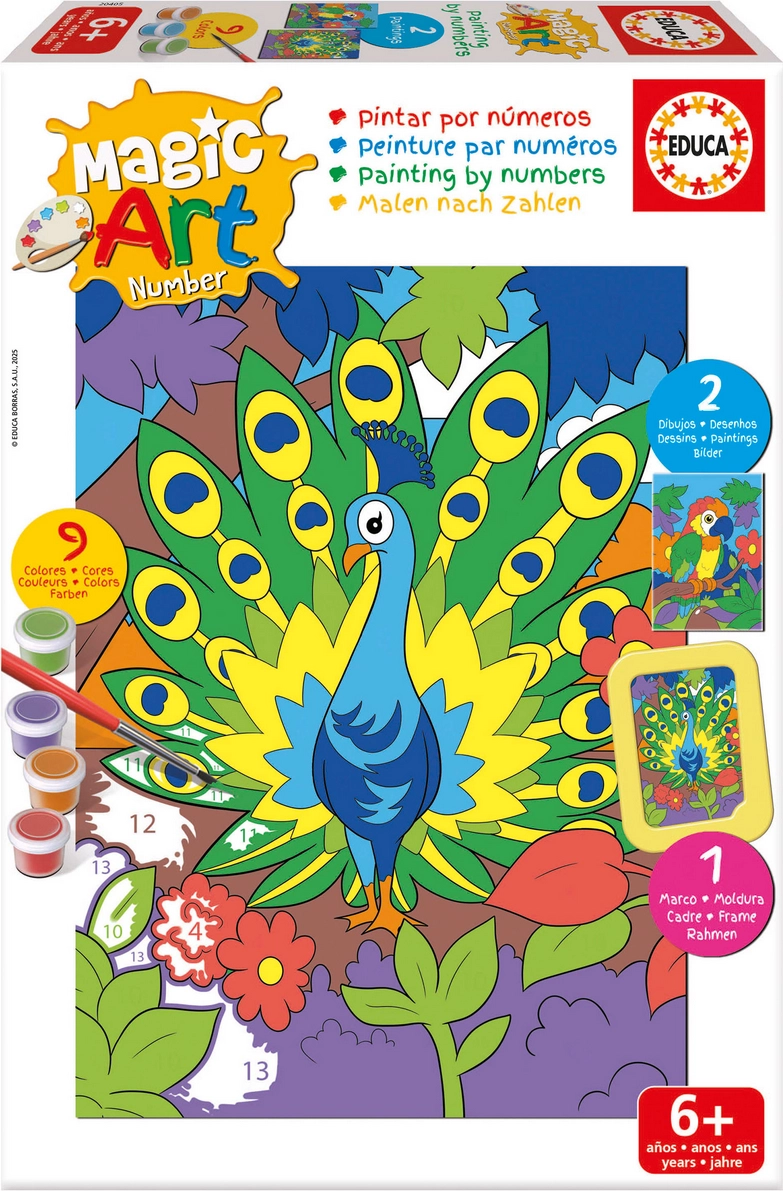 Discover the joy of creating with the paint by numbers kit from Educa. Easily paint your own pictures featuring a peacock and a parrot, even without prior experience. This activity supports focus, fine motor skills, and color recognition, while being perfect for both relaxation and fun.