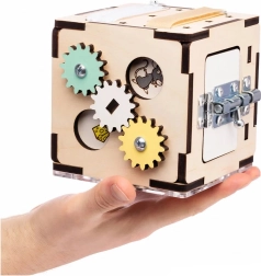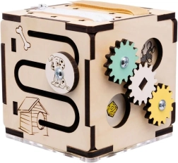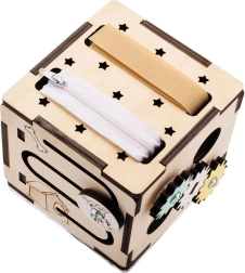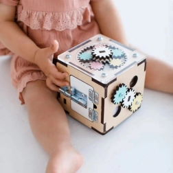 A compact wooden interactive cube BUSYKIDS for children from 1 year offers on six sides spinning elements, zippers, buckles and locks to develop fine motor skills, sensory perception, and logical thinking. It is lightweight, safe, and easy to carry – ideal for home and travel.