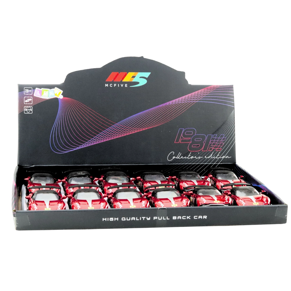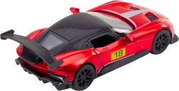 The striking red body, racing decals, and large rear wing make this car an eye-catching piece for play and display.