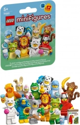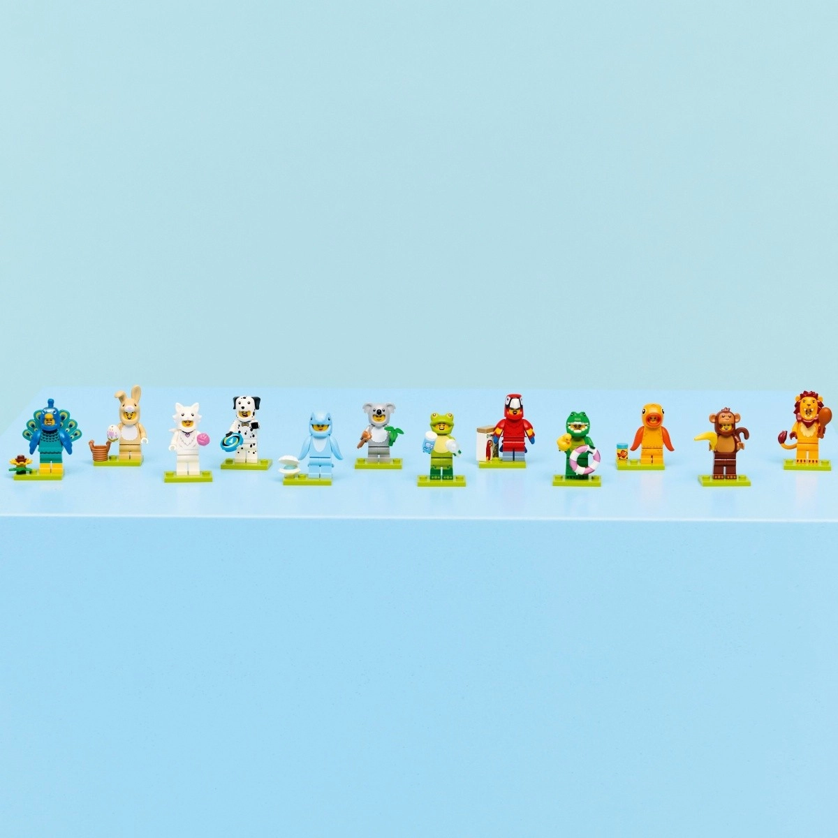 The series features costumes: parrot, lion, frog, crocodile, dalmatian, goldfish, adorable bunny, peacock, fluffy cat, koala, dolphin, and monkey. Each figure comes in a sealed mystery box, so the surprise is guaranteed – collect all 12 minifigures to expand your LEGO display or play world.