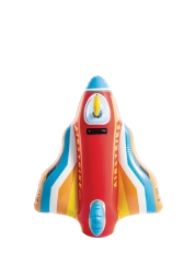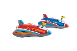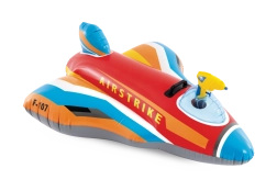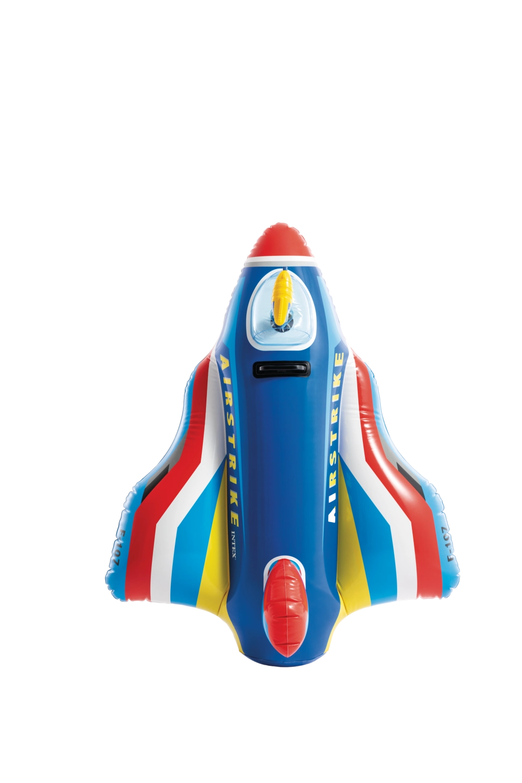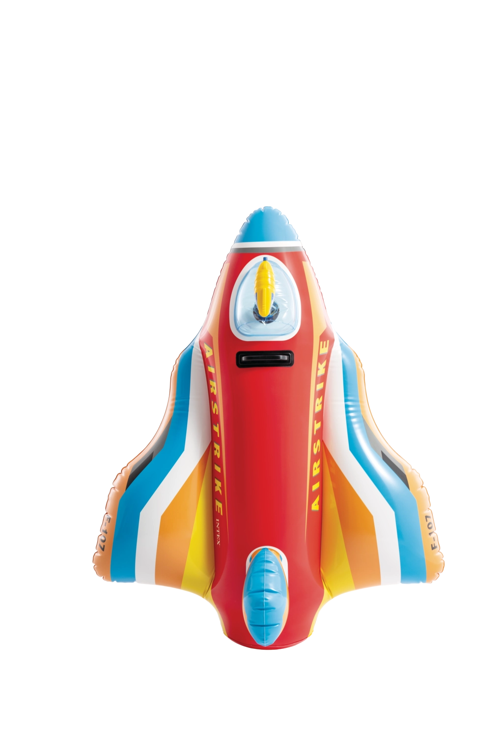 The durable construction made of quality PVC and the sturdy handle ensure safer play and better control while riding. The vibrant color mix of red, blue, yellow, and white, along with the AIRSTRIKE and F-107 markings, gives the toy an attractive look that instantly appeals to kids.