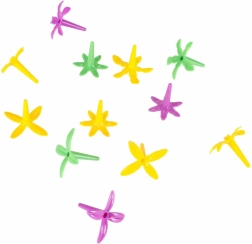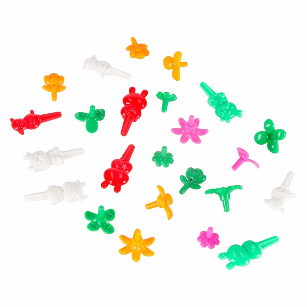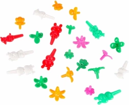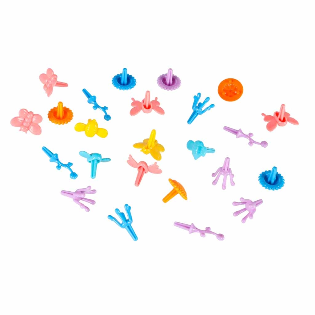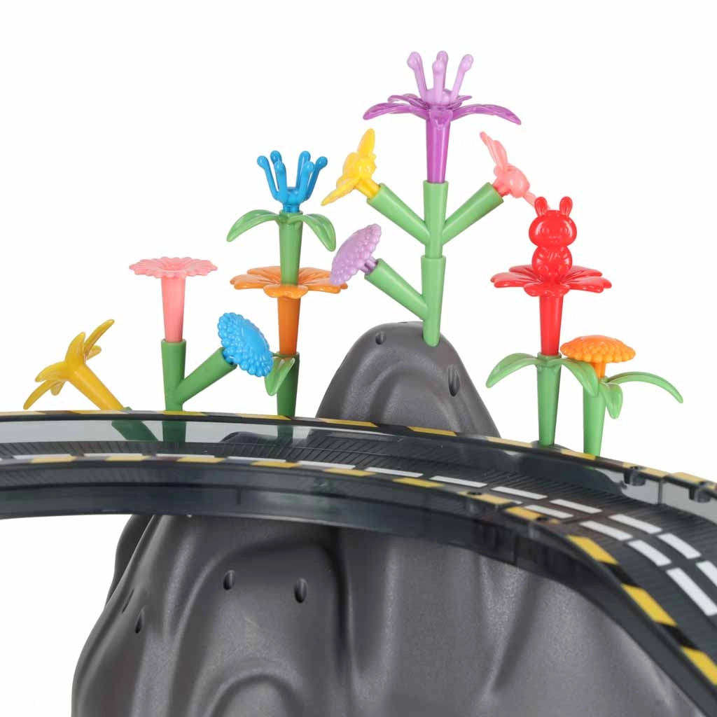 1× light-up car with figure, 13× track segment, 15× bottom connector, folding bridge and gate, rocks (2 pcs), embankments (5 pcs), fences (5 pcs), flags (2 pcs), direction signs (2 pcs), flowers with stems (84 pcs), small trees (2 pcs), butterflies (9 pcs), small animals (9 pcs), manual