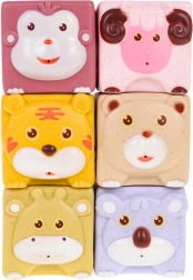 Includes square blocks with animal motifs, round pieces for tower building, squeezable figures, and sensory balls. The toys are suitable for dry play and for the bath, dry quickly, and are easy to clean—ideal for everyday use at home or on the go.