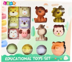 - 6× square animal blocks, 6× round pieces for tower building, 3× animal figures, 3× sensory balls