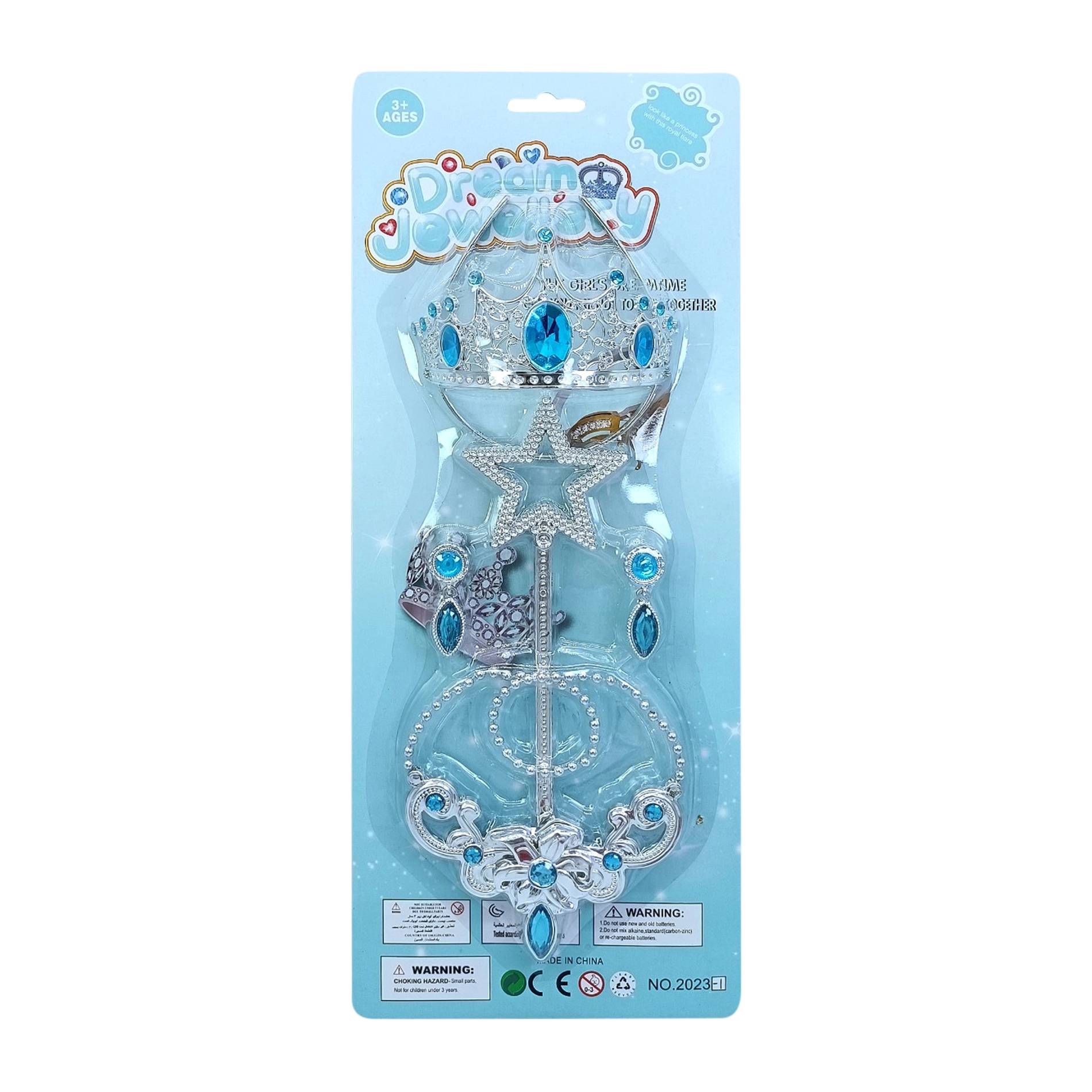 Transform into a real princess in no time! This kids’ set includes a silver crown, a magic wand, an elegant necklace, and sparkling earrings with radiant blue gems. Perfect for carnivals, birthday parties, and princess pretend play at home.