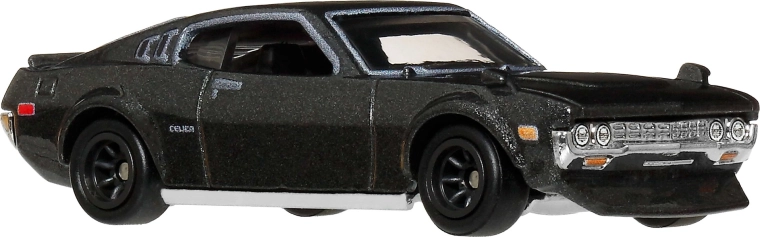 The collectible model of the ’77 Toyota Celica from the Hot Wheels Premium Japan Historics 5 series delights with realistic detailing, a metal construction, and Real Riders tires. Perfect for display or play thanks to the 1:64 scale and free-rolling wheels. Length approximately 7 cm, an officially licensed product in decorative packaging.