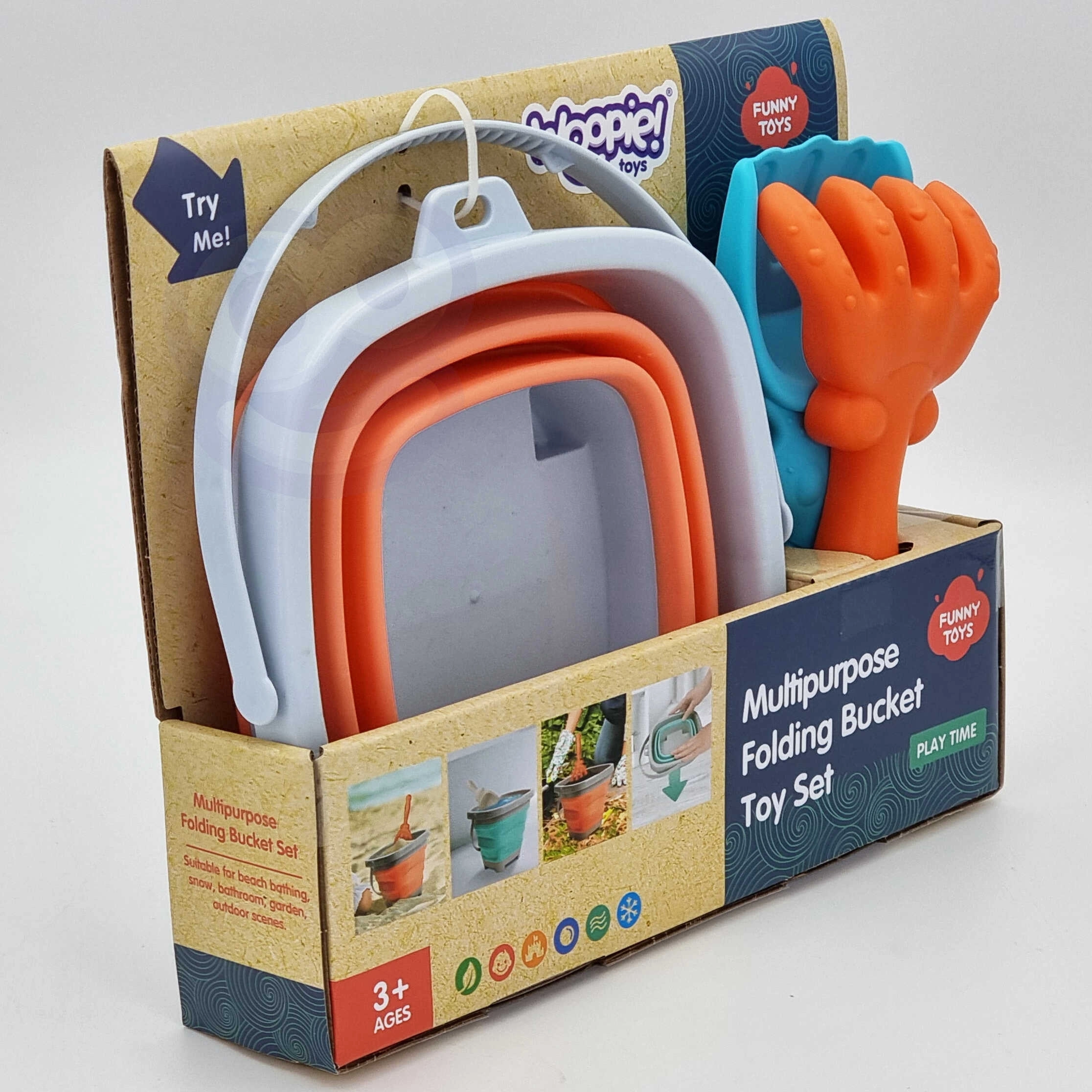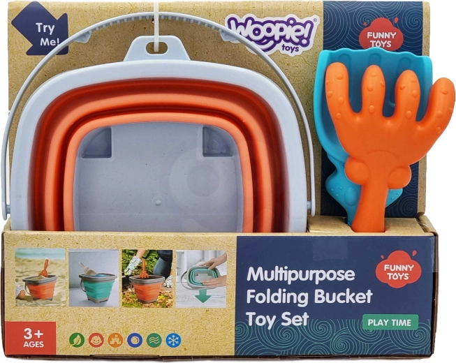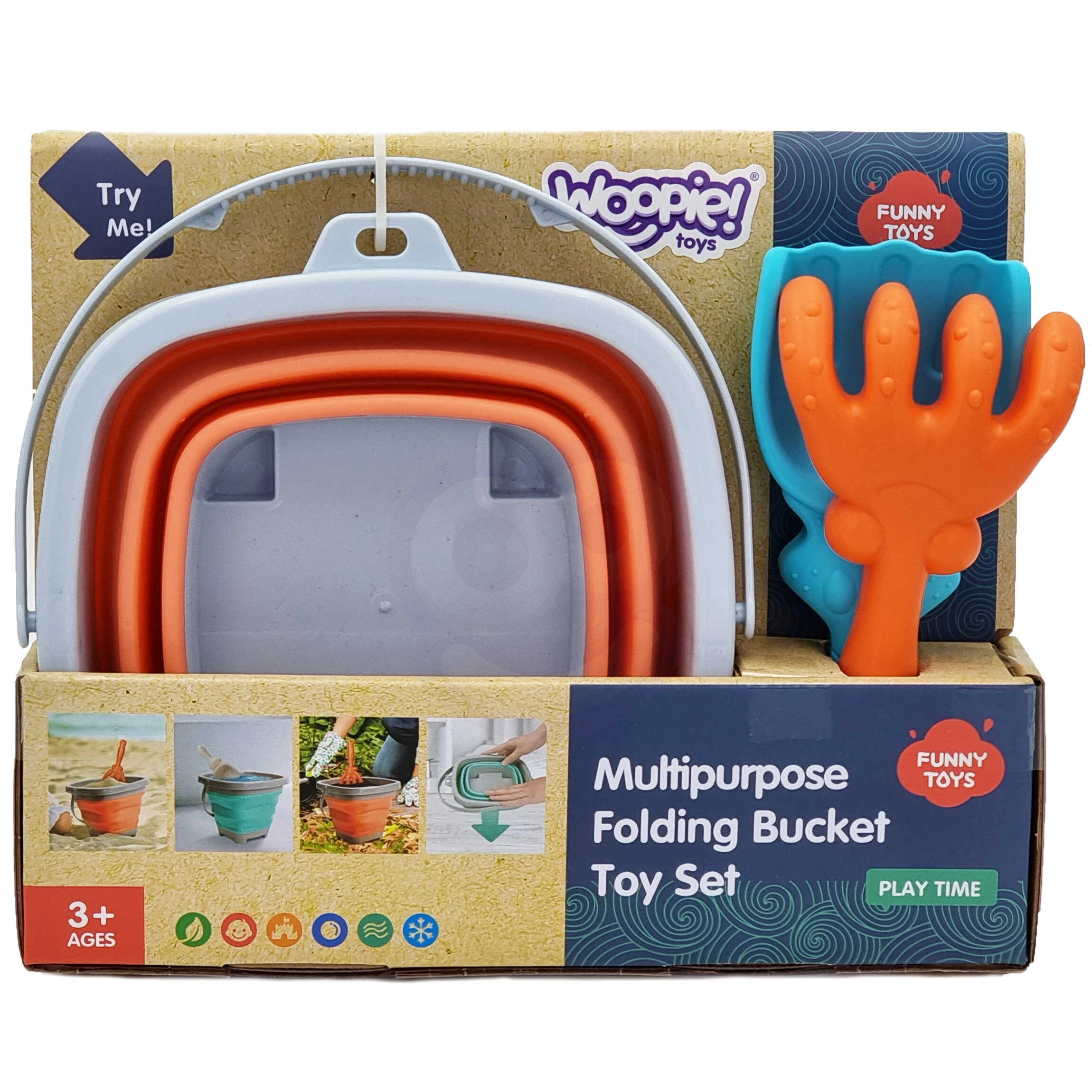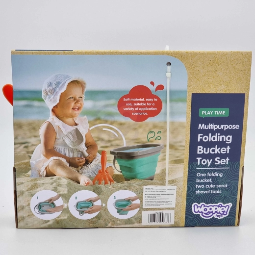 The WOOPIE foldable bucket is designed for comfortable outdoor play – in the sandbox, at the beach, and in the garden. The sturdy plastic rim, base, and handle provide stability, while the strong silicone sides fold into a practical accordion for compact storage and easy carrying.
