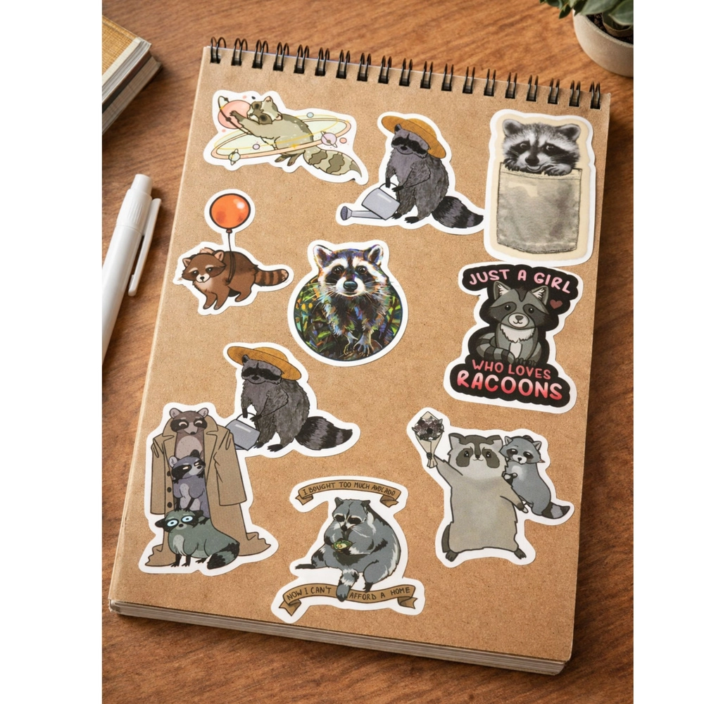 Discover a playful set of 50 stickers featuring adorable raccoons in various designs. Ideal for decorating notebooks, planners, laptops, and bottles. Easy to apply, with vibrant colors and versatile use to help you create original compositions and personalize everyday items.