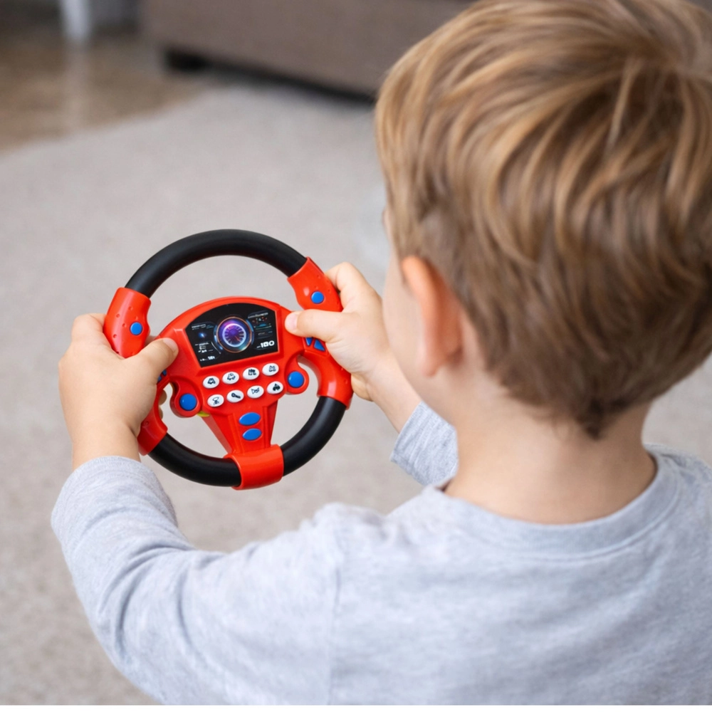 A fun and educational steering wheel for little drivers offering realistic controls, vehicle sound effects, and safe suction-cup mounting. With a rotating rim, a clear button panel, and a compact size, it supports hand–eye coordination, creativity, and learning through play.