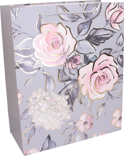 Stylish M-size gift bag for year-round use with elegant floral motifs. Practical size 26 × 32 × 12 cm, sturdy paper construction and durable cord/ribbon handles ensure comfortable carrying. Glossy and metallic details give your gift a premium look. Available in 4 different variants.