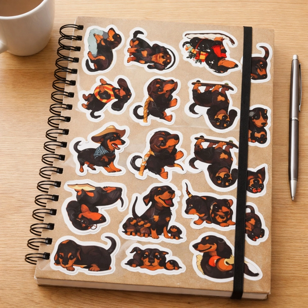 A cute set of dachshund-themed stickers featuring 54 different designs for decorating notebooks, journals, planners, or gifts. Each sticker shows a dachshund in a different pose, making it easy to create unique compositions. The stickers are easy to peel and adhere, have a practical size of approx. 5–6 cm, and stick well to smooth surfaces.