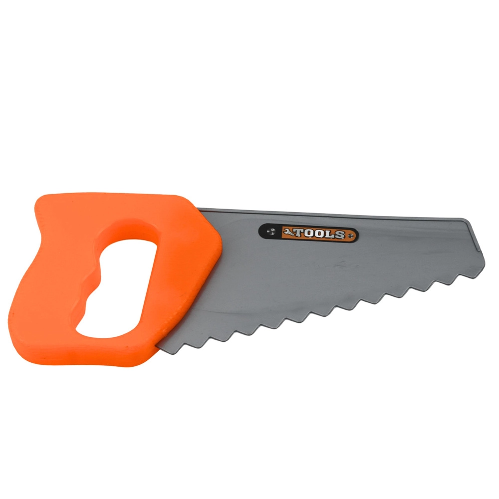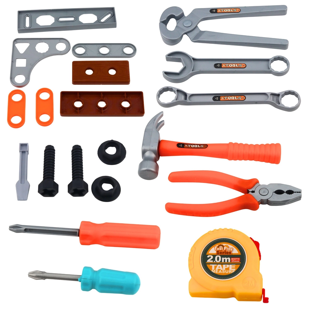 Hand saw, hammer, screwdrivers, wrenches, and a measuring tool expand play options and develop fine motor skills.