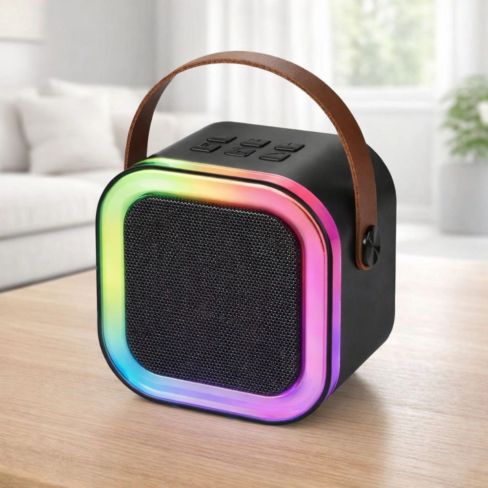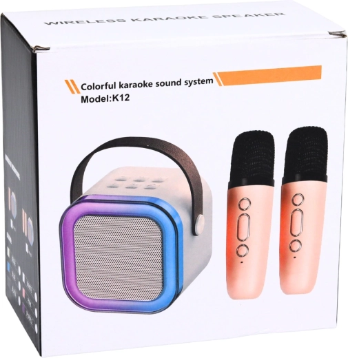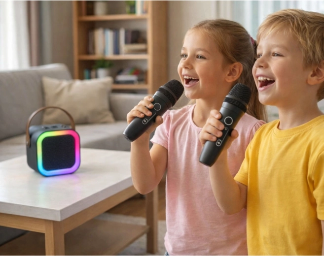 Enjoy singing anytime, anywhere. This portable karaoke set combines a stylish cube speaker with a multicolor LED ring and a pair of wireless microphones for duets and competitions. Its lightweight design, practical strap, and power from a built-in battery make it an ideal choice for birthdays, family gatherings, and garden parties.