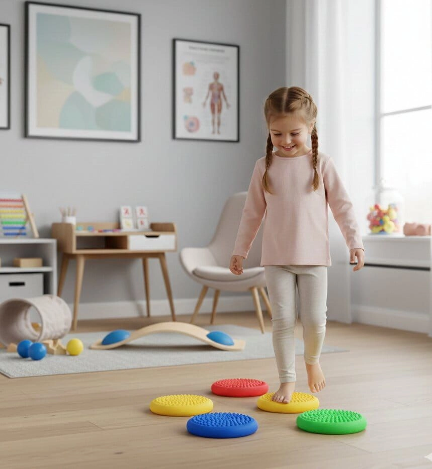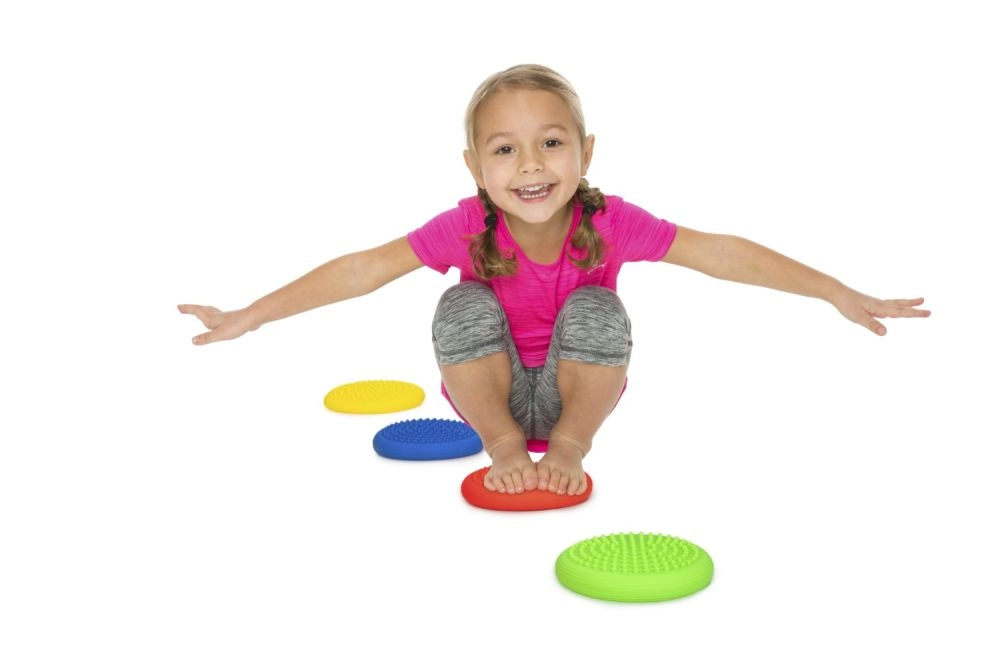 Colorful discs motivate children to move, develop coordination and proprioception, and strengthen the deep stabilizing system.
