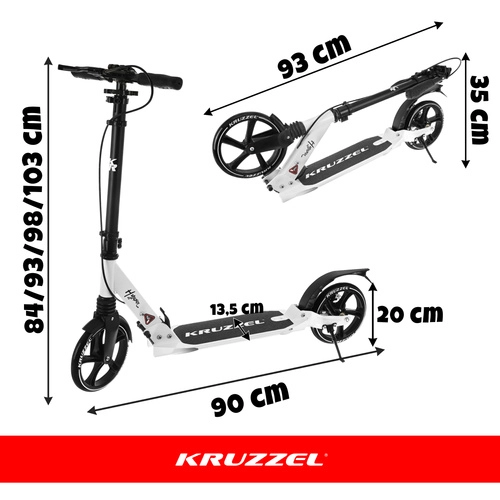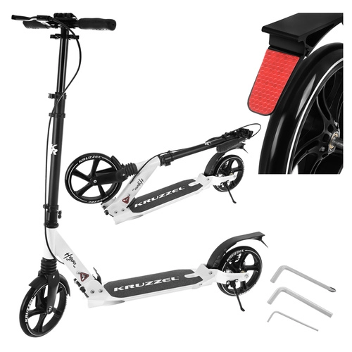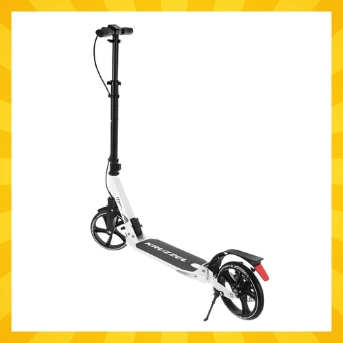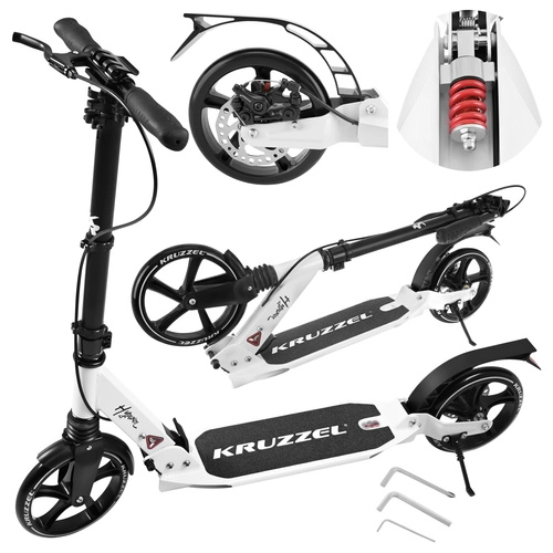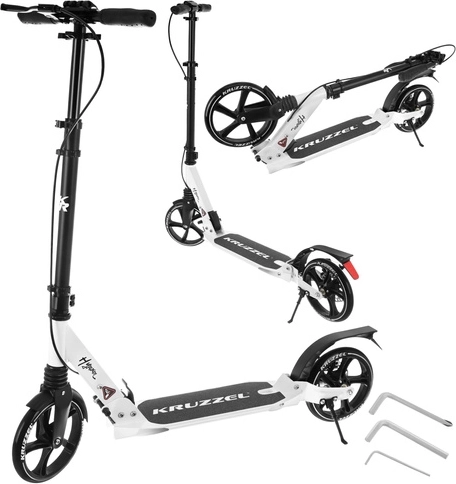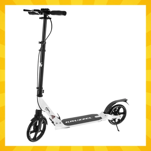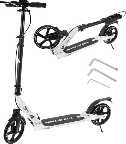 The premium folding scooter KRUZZEL Hyperion for kids and adults offers large 200 mm rubber wheels, ABEC-9 bearings, dual braking (hand and foot), and a lightweight aluminum frame. Thanks to quick folding, suspension, and height-adjustable handlebars, it’s ideal for comfortable and safe commuting on sidewalks and bike paths.