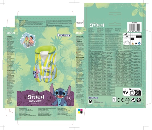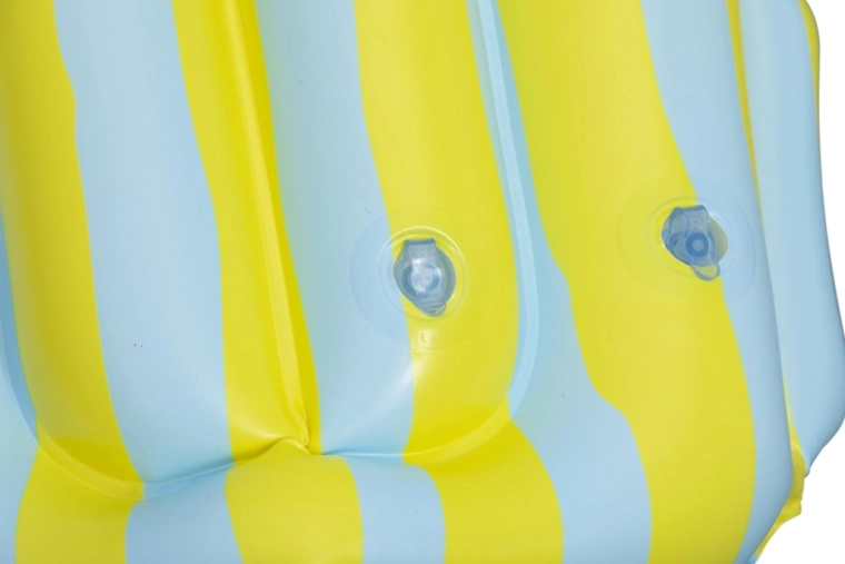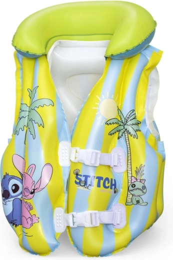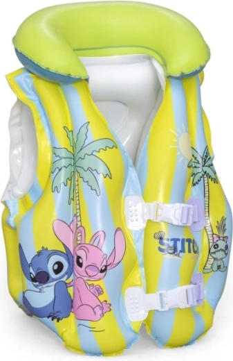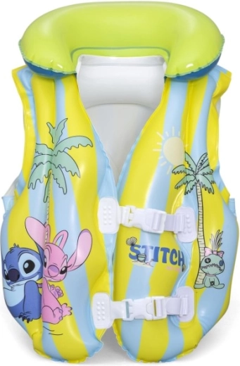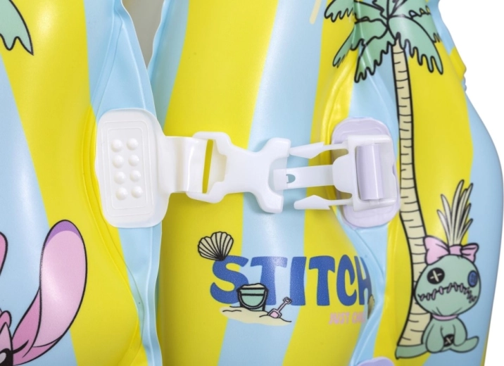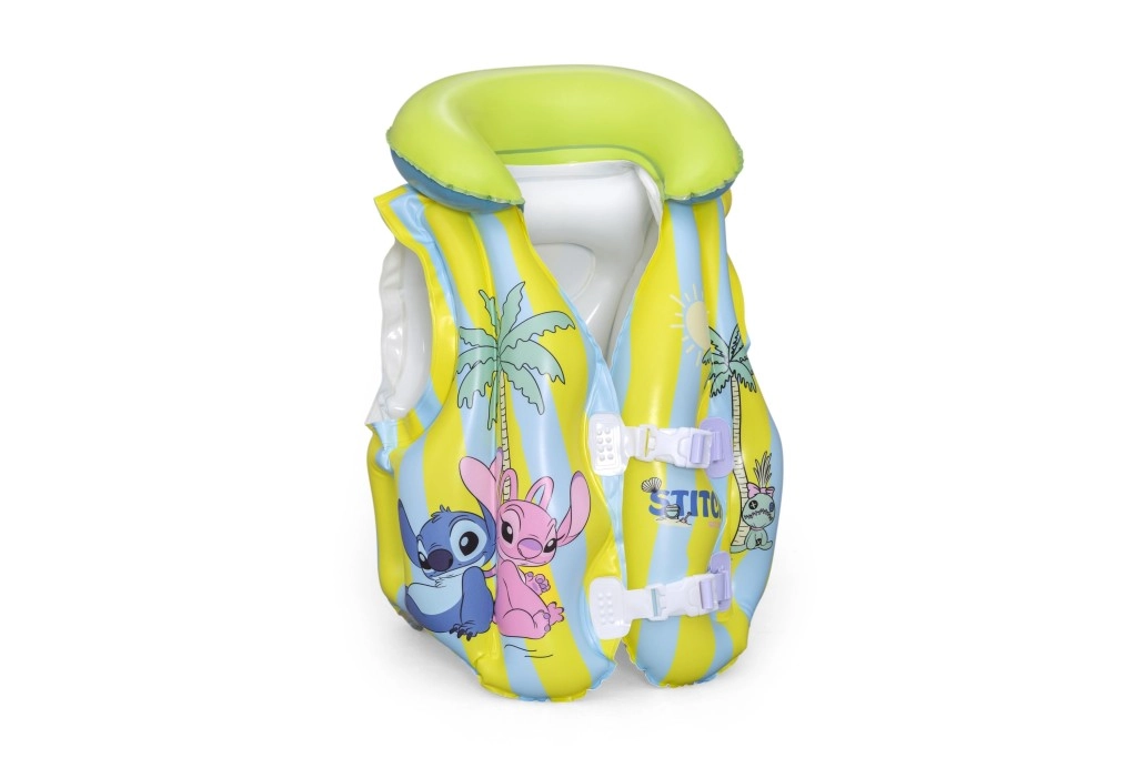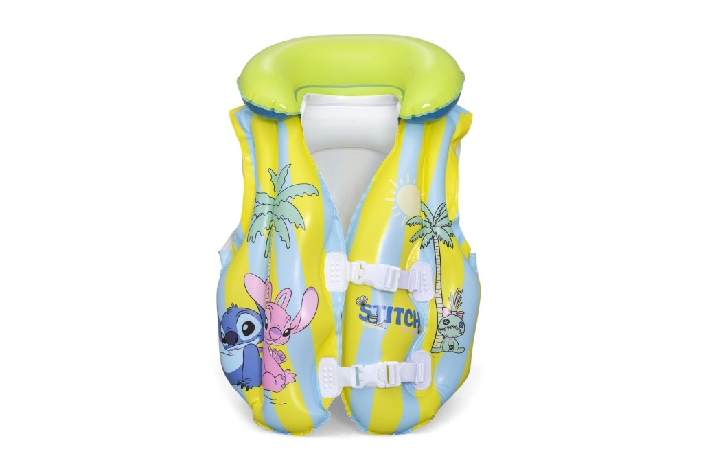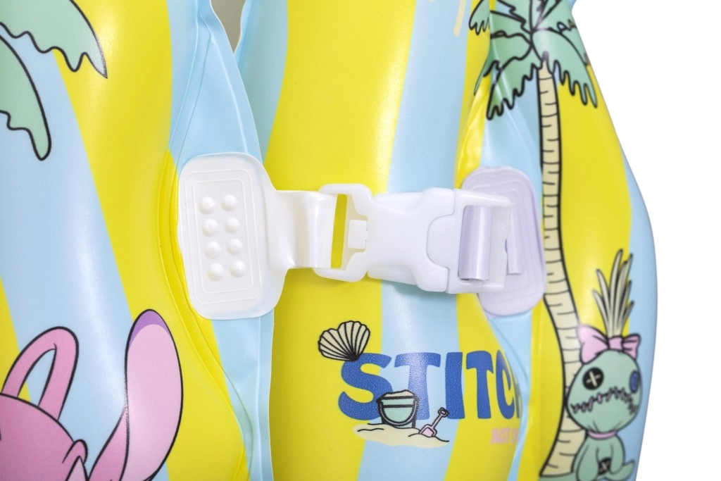 This kids’ inflatable vest with the popular STITCH motif helps young swimmers feel more confident in the water. Thanks to multiple inflatable chambers, a soft collar, and adjustable buckles, it easily adapts to the body and ensures stability in the pool and on calm water surfaces. Pastel yellow and light blue stripes with playful prints increase visibility and add a fun look.