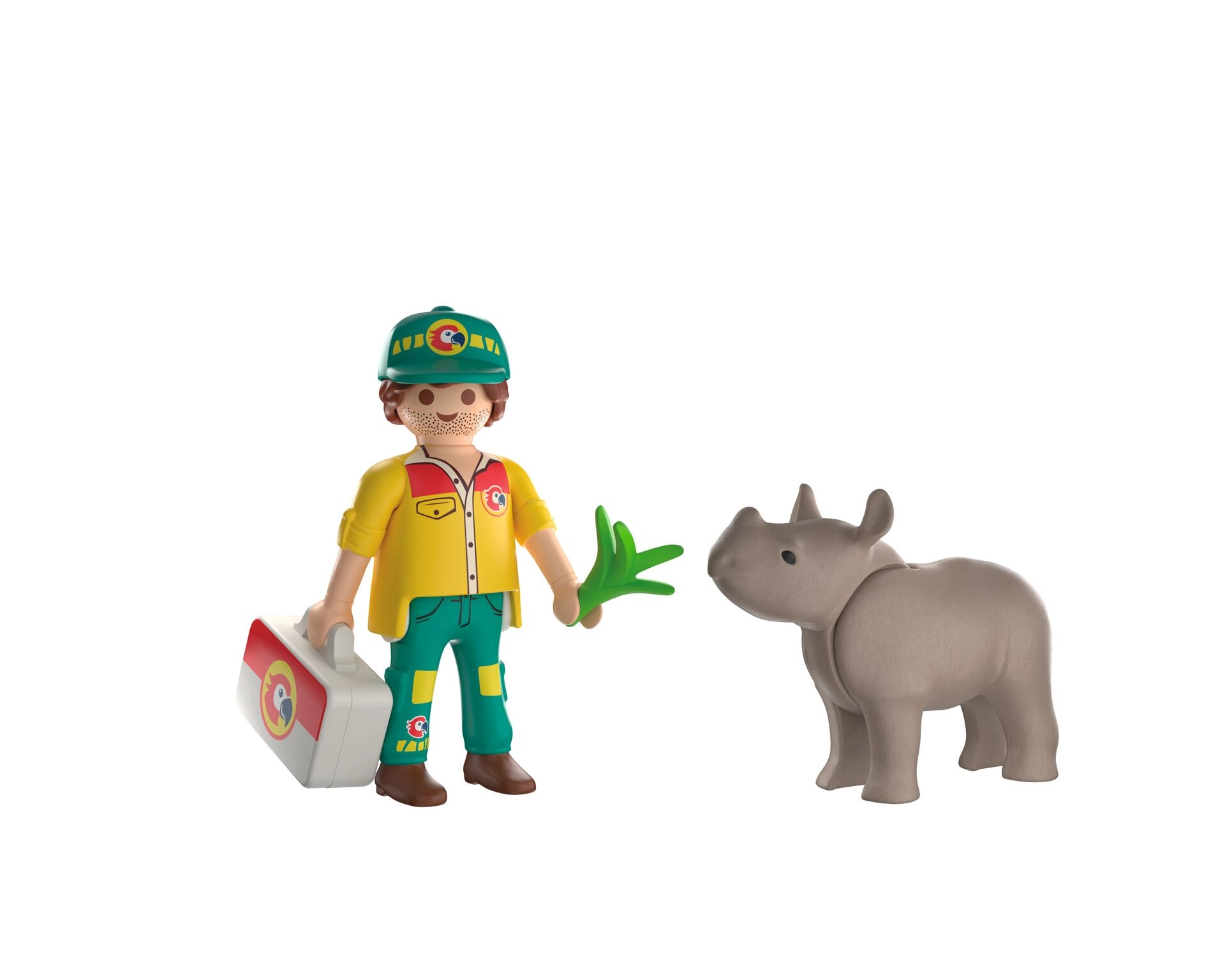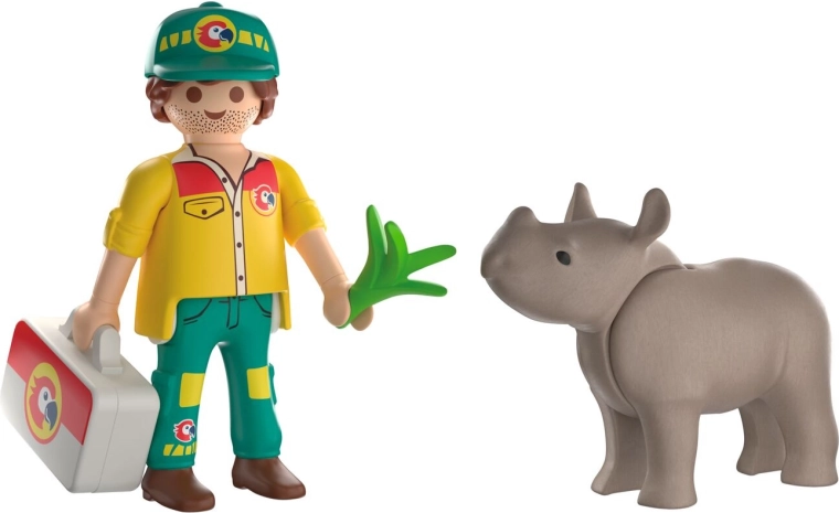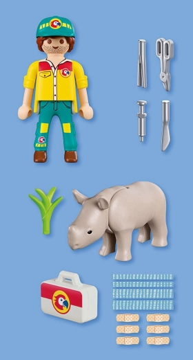 - Caretaker figure, rhinoceros figure, medical bag, set of medical tools, sticker sheet with plasters and bandages, plant piece