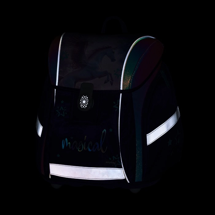 Reflective elements increase the child’s visibility at dusk. Magnetic fastening allows quick and intuitive opening and closing of the flap.