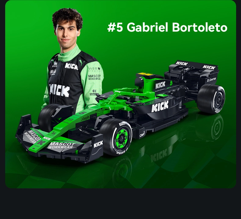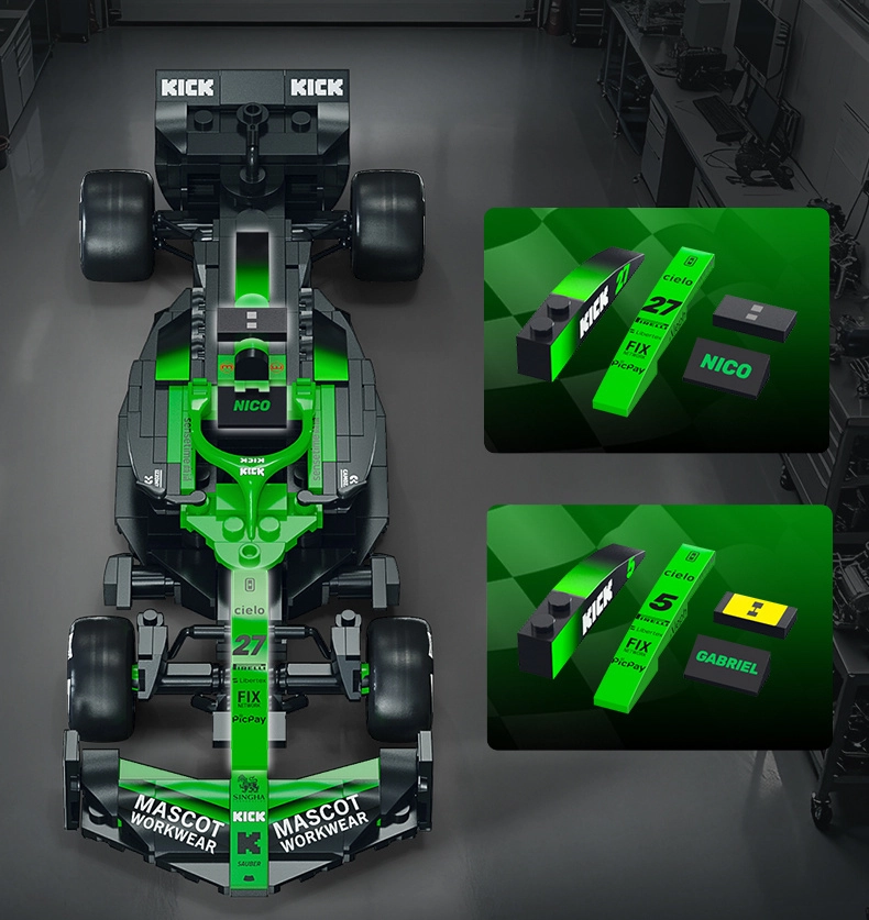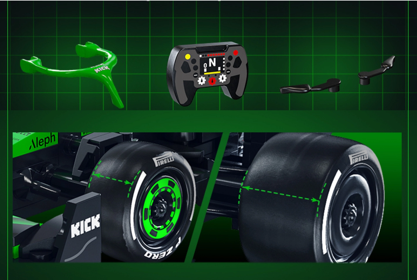 Build the iconic KICK SAUBER F1 C45 single-seater at 1:24 scale from 348 pieces. The model features realistic details such as the Halo system, mirrors, and steering wheel, has functional wheels for smooth movement on flat surfaces, and is ideal both for play and for stylish display. A great gift for motorsport and building set fans.