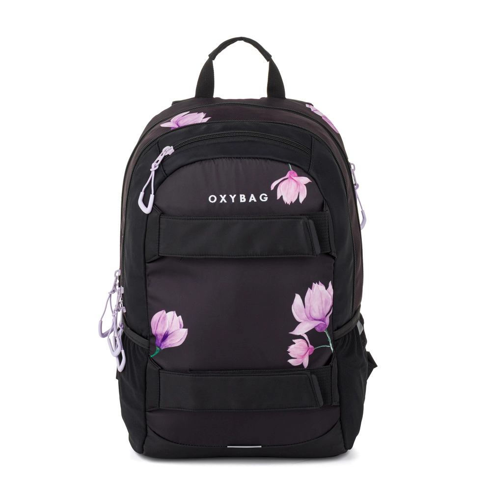 The OXY Sport Flowers set combines functionality and design. The backpack has two main compartments and a front pocket with sturdy zippers, a reinforced internal laptop sleeve, a key carabiner, smaller pockets for essentials, and a hidden back pocket. For everyday convenience, there’s a side bottle pocket, padded shoulder straps, and a chest strap for stability. The zippered pencil case with an elastic band keeps writing tools neatly in place.