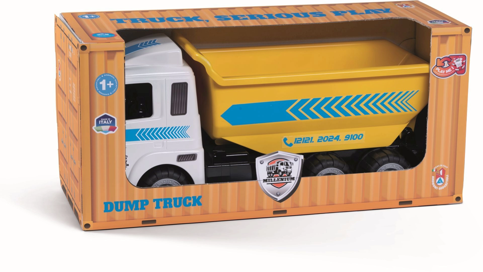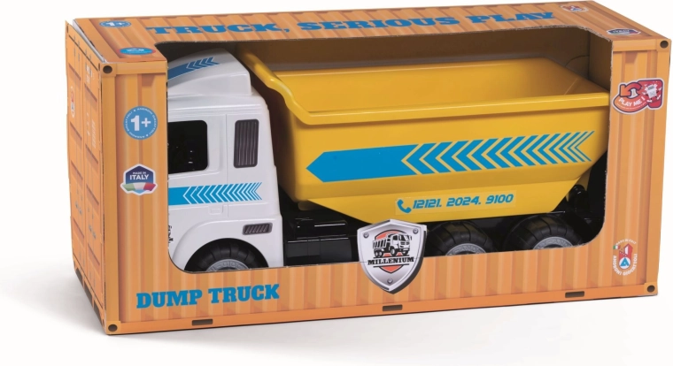 A large plastic tipper from the HEAVY TRUCKS line for little builders, offering a robust design, rubberized wheels for quiet rides, and a tilting dump bed for fun transporting of small items. Made in Italy from high-quality, safe plastics, suitable from 12 months.