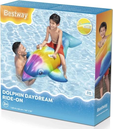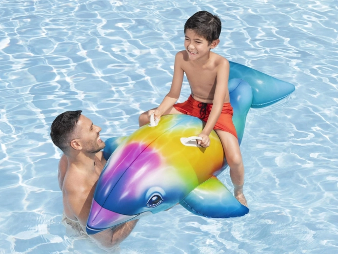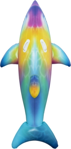 The large dolphin with a multicolored effect is perfect for the pool, lake, and calm sea—inviting play and relaxation.
