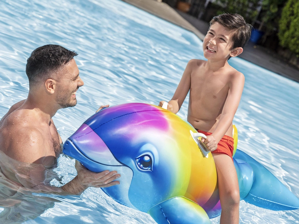The BESTWAY ride-on dolphin is an ideal choice for kids’ water fun. Thanks to the two robust handles, getting on and holding on while moving is easy and safe, while the two independent air chambers increase stability on the water. The quality PVC material withstands everyday use and contributes to long life.