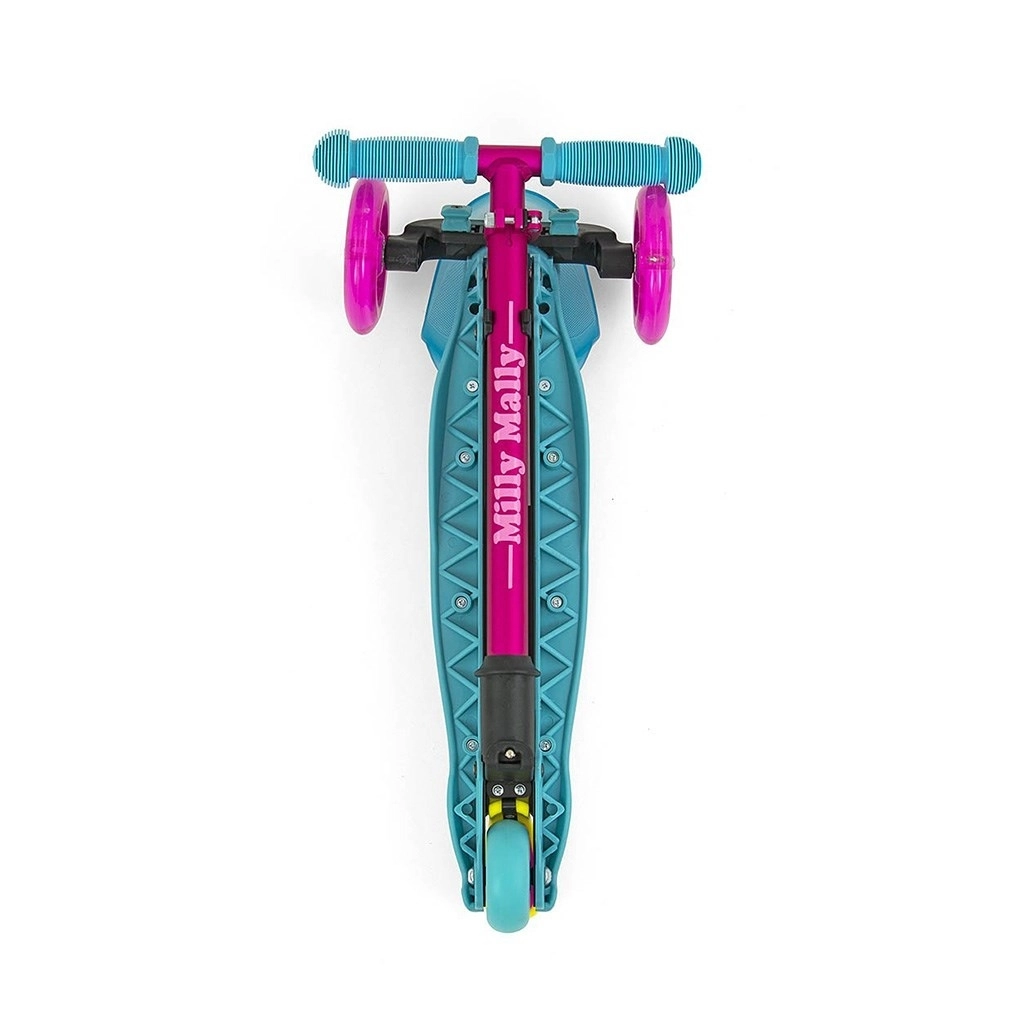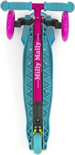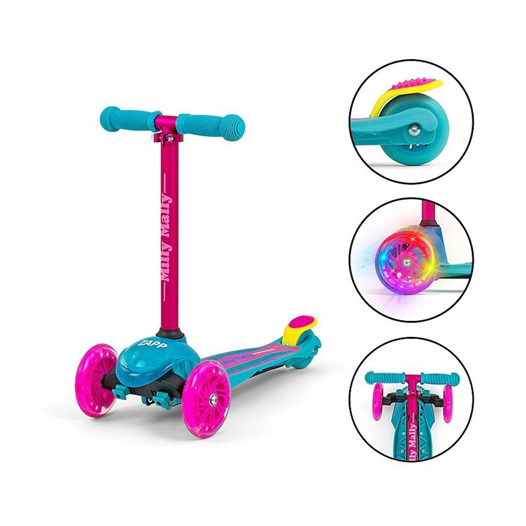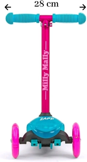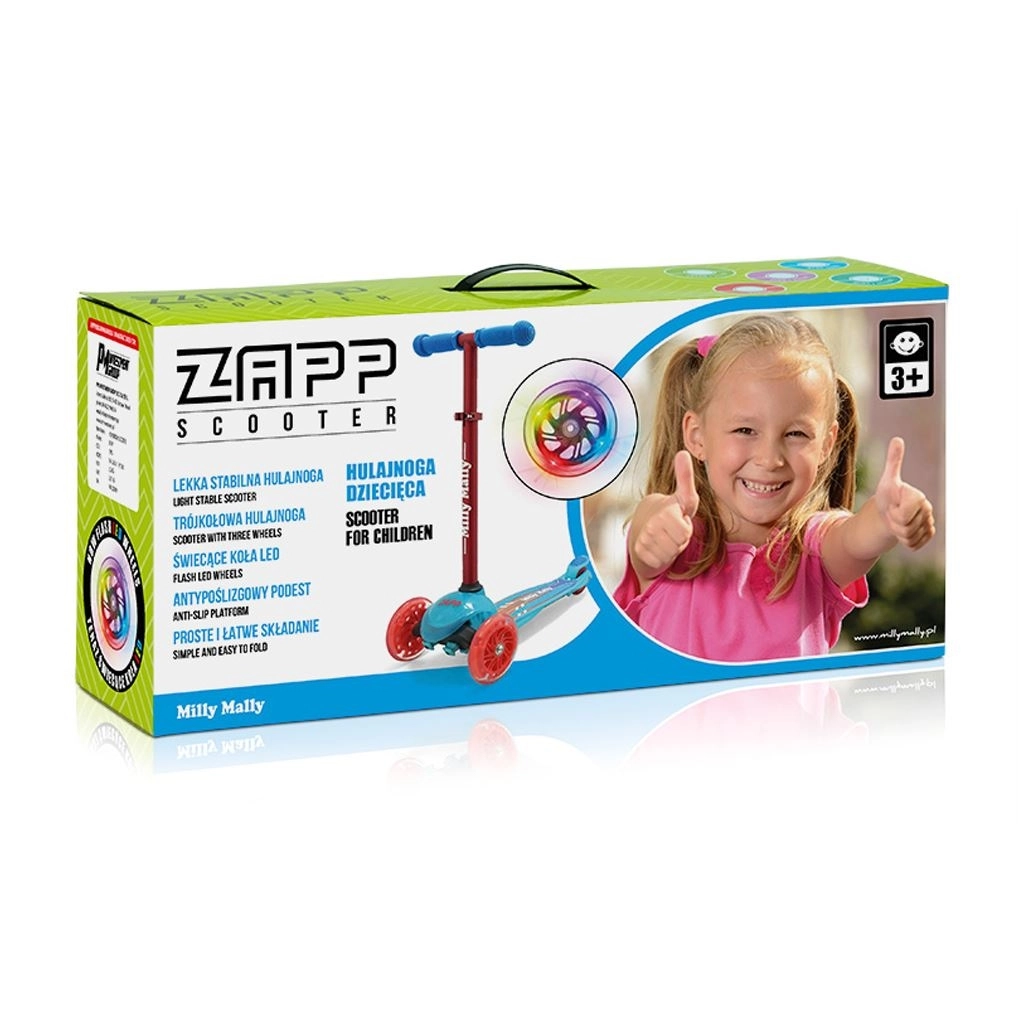 Lightweight and durable kids’ scooter MILLY MALLY Zapp with three wheels for high stability, front light-up wheels, and adjustable handlebars (61/66 cm) is great for young riders from 3 years. Thanks to lean-to-steer control (turning by shifting weight), a rear foot brake with mudguard, and rubber wheels with bearings, it offers a safe and fun ride indoors and outdoors.