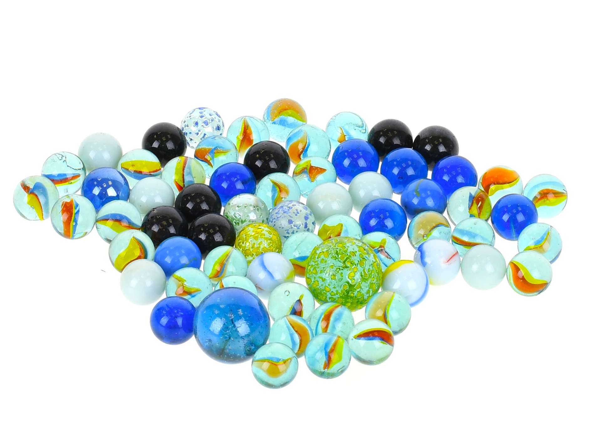 Inside the pack you will find approximately 80 marbles in various sizes and color combinations—from blue and turquoise tones to black and green variations with elegant swirls. The set is great for play, competitions, developing fine motor skills, and as a decorative filler for bowls and vases.