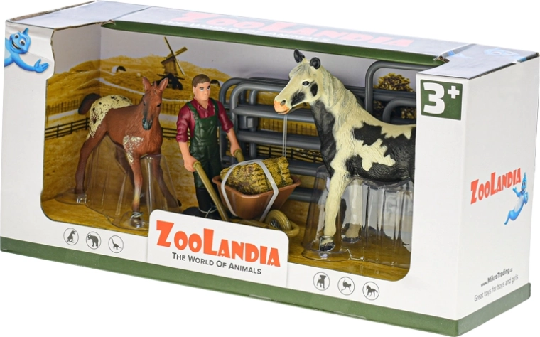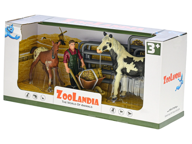 Spark kids' imagination with the ZOOLANDIA farm set. Realistically shaped horse and foal figures, a free-standing farmer, and a modular paddock with an opening gate create the perfect base for farm stories. Children can feed, transport hay, and safely close animals in the enclosure.
