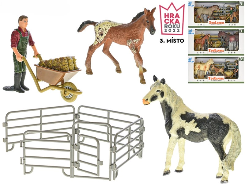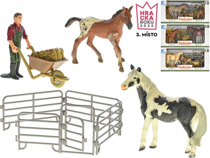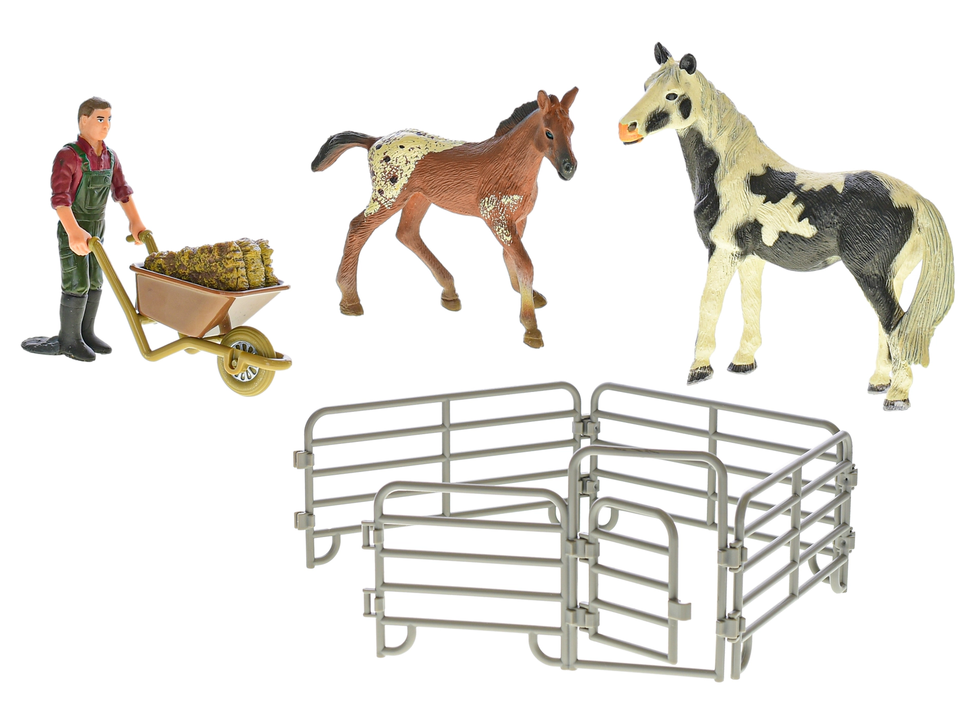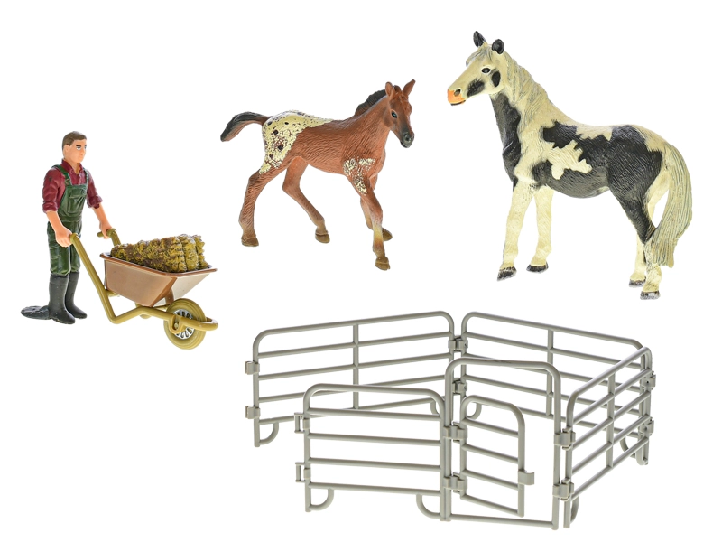 horse figure, foal figure, farmer, wheelbarrow with hay, modular paddock with gate, accessories