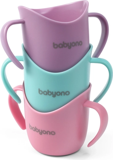 The BabyOno training cup is designed to match the anatomical and motor skills of toddlers. It supports a natural way of drinking from an open container, making it an ideal transition from a bottle or a non-spill cup. The tilted rim and wide, ergonomic handles let the child adjust the angle and pace of drinking, reducing the risk of spills and supporting proper jaw movement.