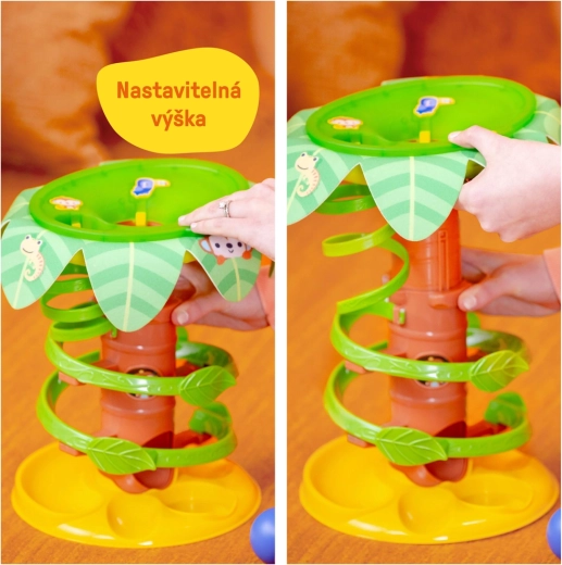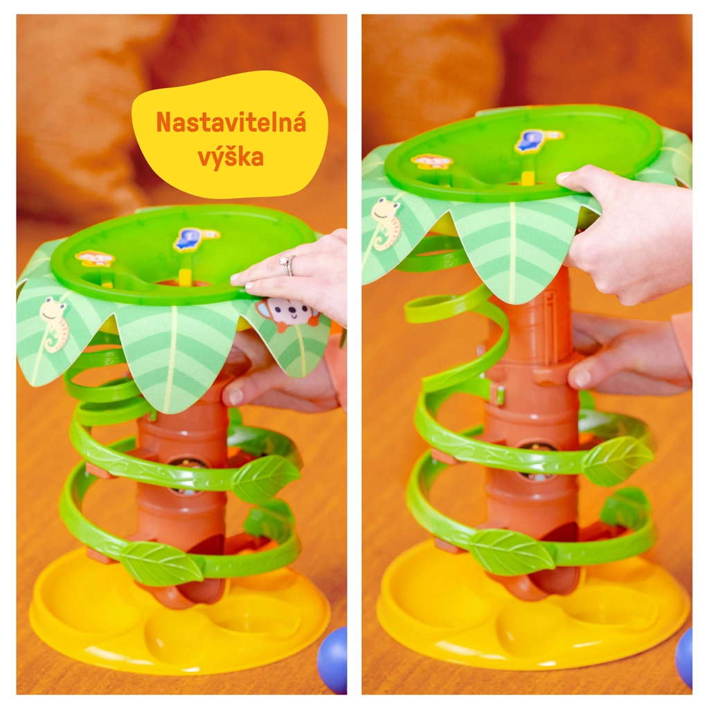 Discover a fun ball run that develops the senses and motor skills of children from 6 months. With more than 50 melodies, sounds, and lights, it brings playful learning of cause and effect. Kids can toss balls into the tree canopy, watch them roll down the spiral track, press the light-up musical buttons with the monkey and toucan, and crawl and chase the balls across the floor. The adjustable height grows with your child, and the safe base serves as a holder and ball release.