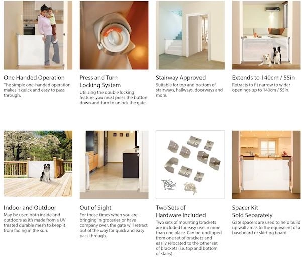 Two sets of mounting brackets enable quick transfer of the gate between two locations. Ideal for doors, hallways, and patios.