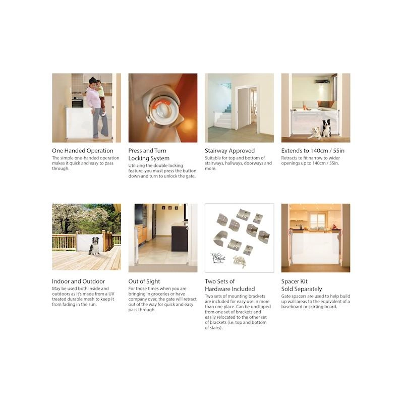 Secure your home smartly and in style. The DREAMBABY retractable safety gate extends smoothly up to 140 cm and, when not needed, elegantly retracts into the side cassette. With two sets of mounting brackets, you can easily move it between two locations as needed.
