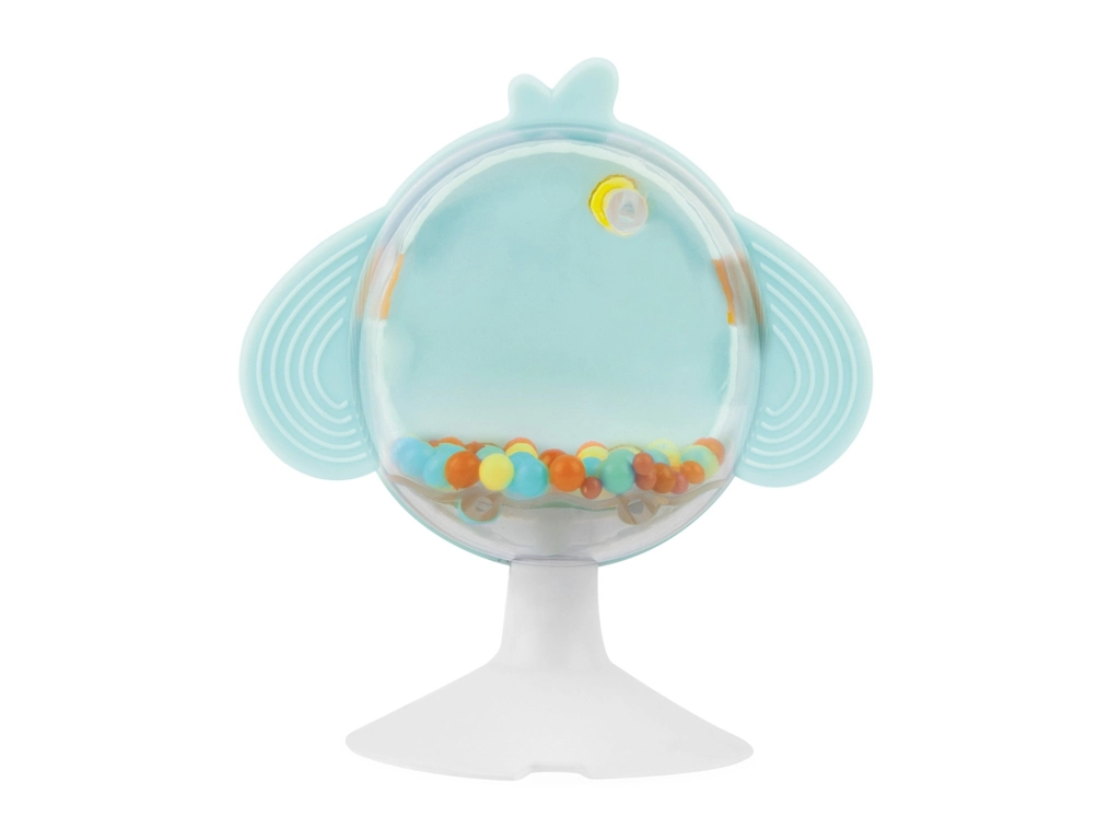 A stable suction cup keeps the toy on the high-chair tray. Textured wings made of soft plastic soothe gums, while colorful beads inside support auditory and visual stimulation.