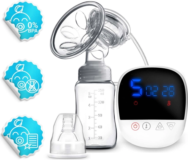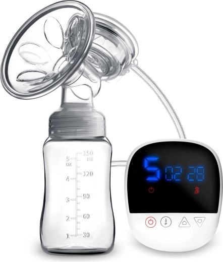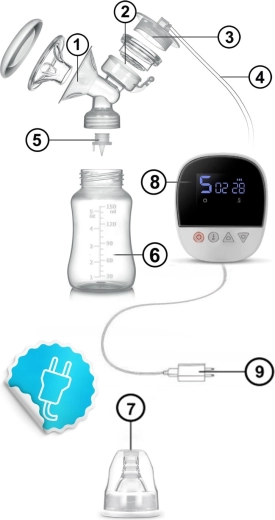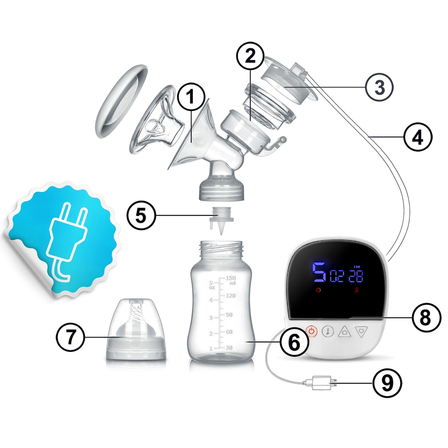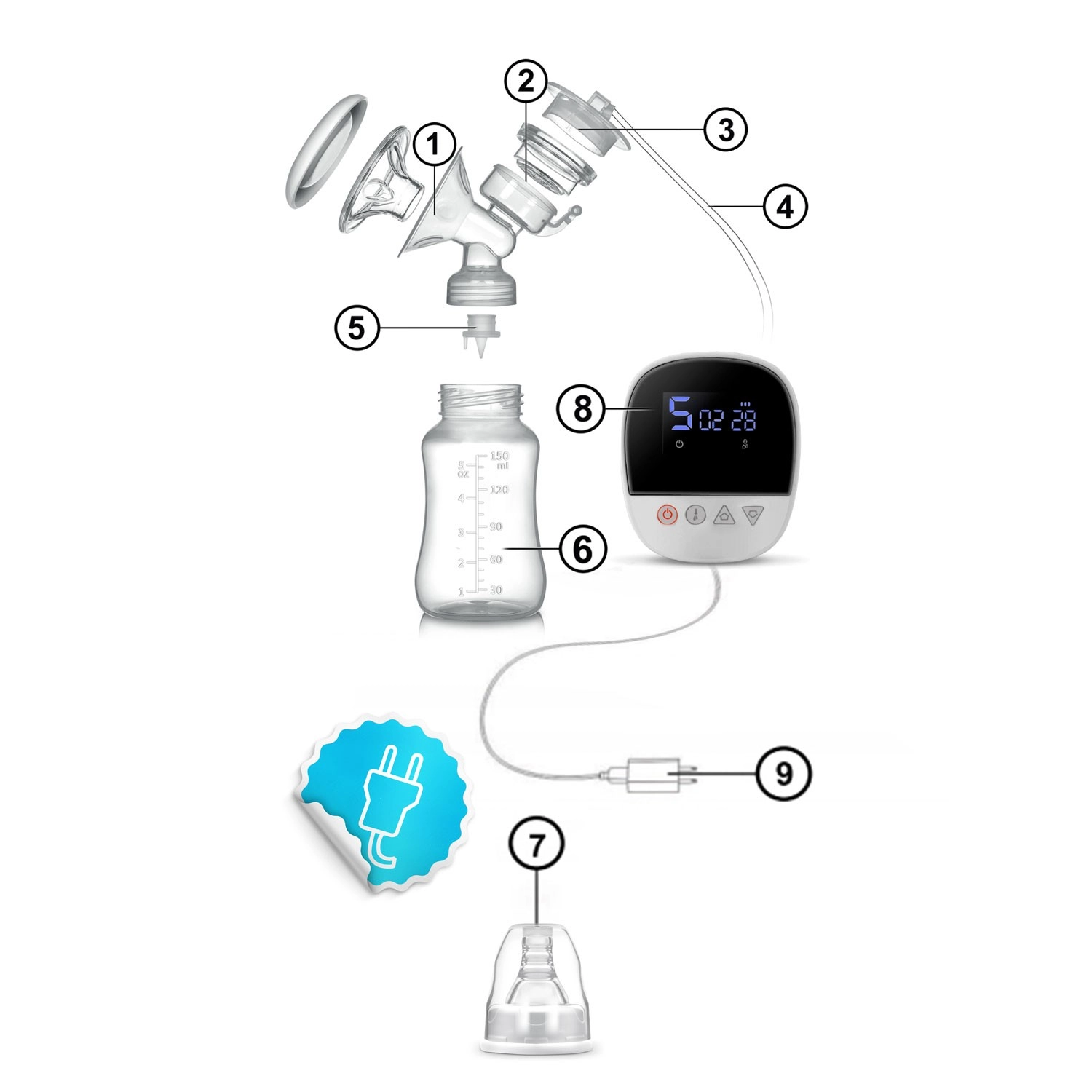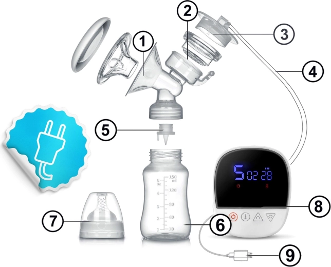 The device is wireless with a durable battery, very quiet, and perfect for travel. The intuitive control panel with display shows time, mode, suction level, and battery status. All parts that come into contact with milk are BPA-free and meet CE, LFGB, RoHS, and REACH standards. Quick disassembly and cleaning simplify daily hygiene and maintain a high safety standard for you and your baby.