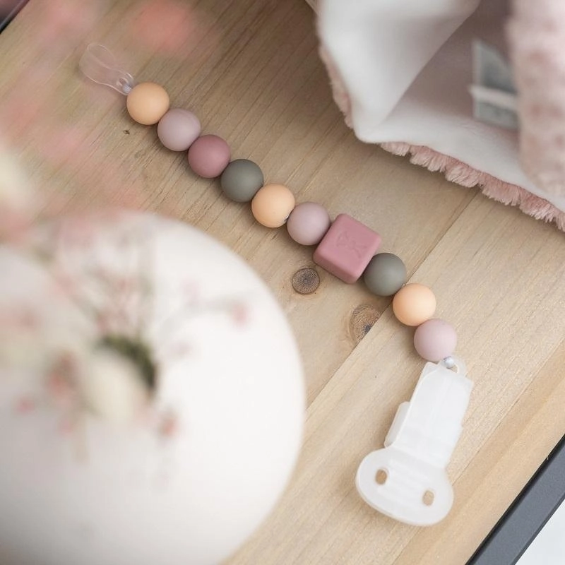 No more lost or dirty pacifiers. The Nattou silicone pacifier clip in a soft peach shade is a practical everyday helper that combines safety, hygiene, and style. Thanks to the reliable clip, it holds firmly to clothing, and the BPA-free silicone beads are gentle on sensitive baby skin.