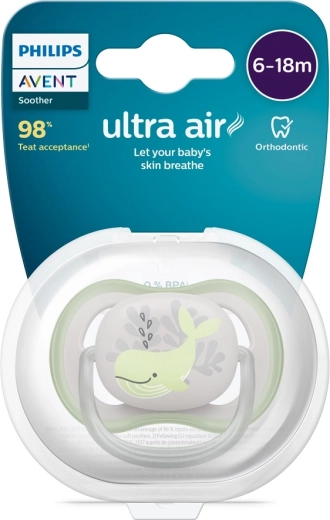 Soothe your baby with the lightweight PHILIPS AVENT Ultra Air soother. Thanks to its exceptionally large ventilation holes, it lets the skin breathe and stay drier. The orthodontic silicone teat made of soft, 100% food-grade silicone supports the natural development of the oral cavity and is easily accepted. A practical case for 3‑minute microwave sterilization is included.