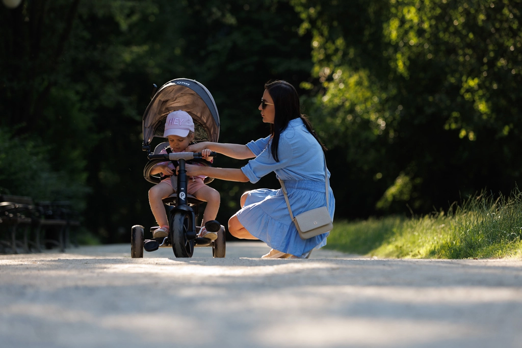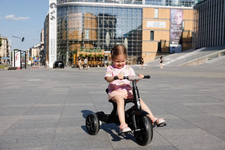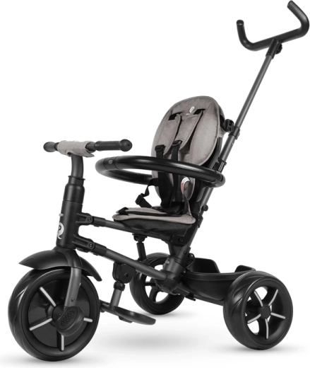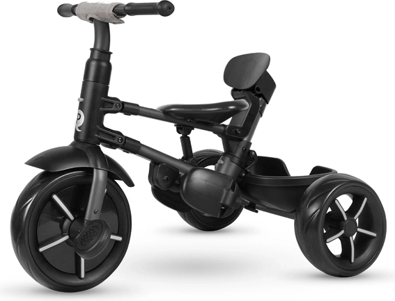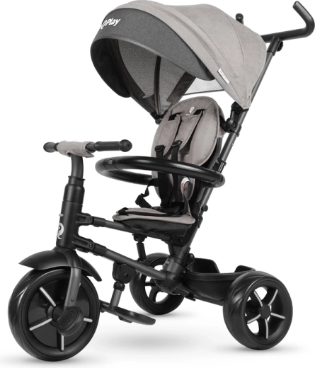 Enjoy comfortable and safe rides with the Qplay Rito Star tricycle in elegant gray. It offers a tool-free folding frame, parent steering with a height-adjustable handle, a sun canopy with UV protection UPF 50+, and 5-point harnesses for maximum safety. Thanks to the pedal freewheel, removable safety bar, and anti-vibration wheels, it grows with your child from 10 to 72 months.
