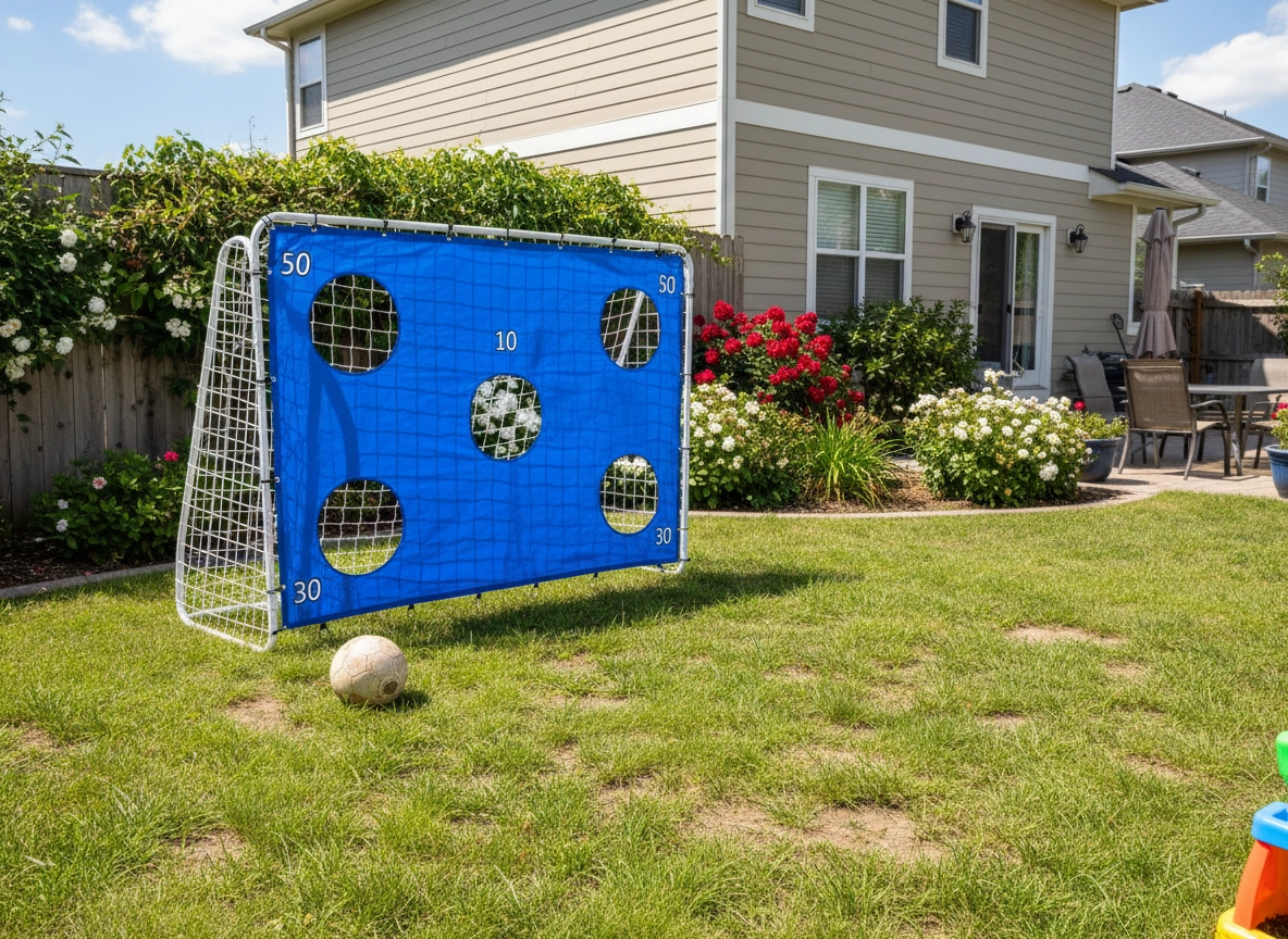 A sheet with multiple holes and point scoring motivates precision training, improves finishing technique, and brings fun for all ages.