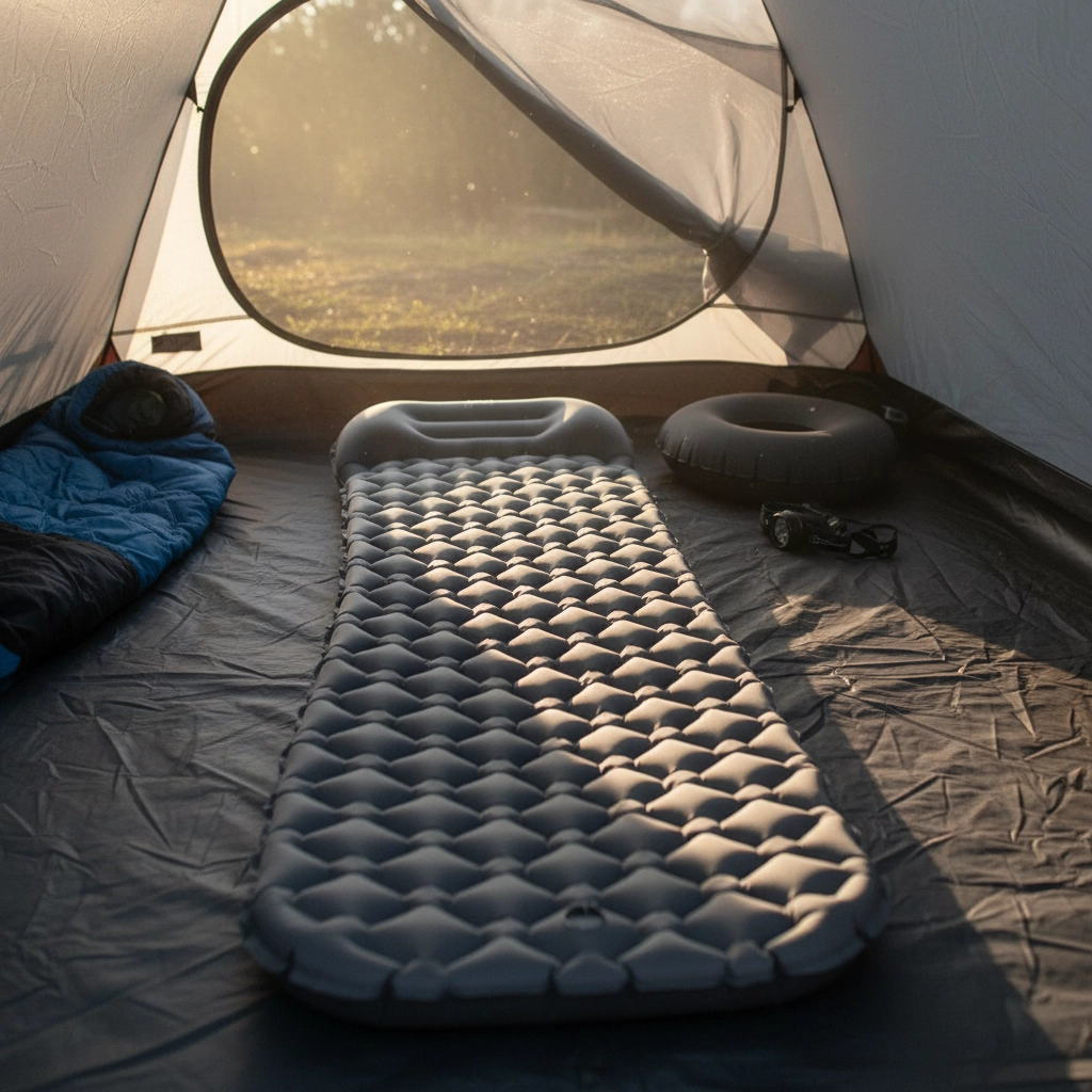 Ultralight inflatable sleeping pad with an integrated pillow for comfortable sleep on the go. Thanks to 40D ripstop fabric with TPU it is abrasion-resistant, offers excellent ground insulation, and packs down compact and light (470 g) – ideal for camping, trekking, and bike trips.